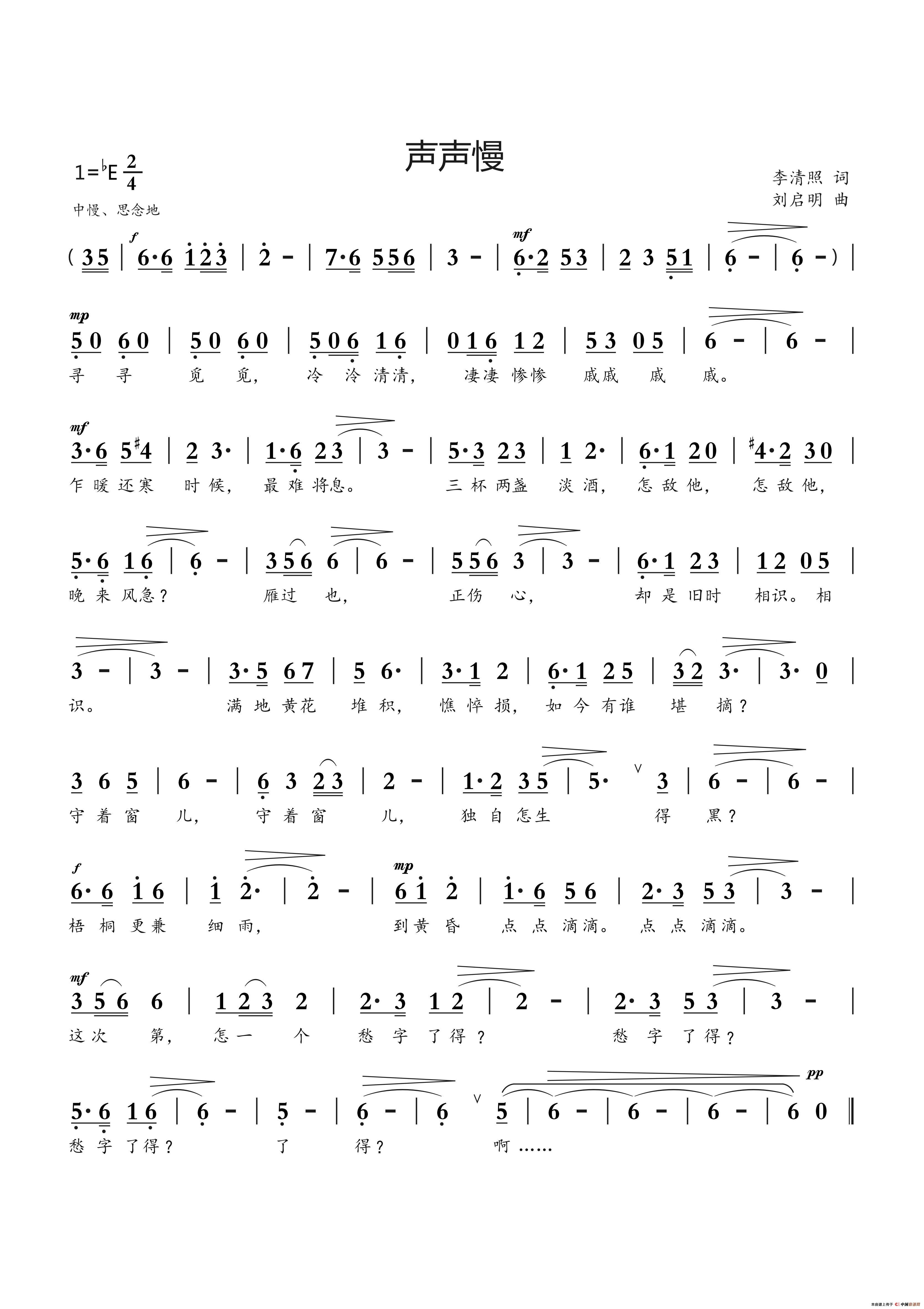 最喜欢李清照这首《声声慢》,特别是开头:“寻寻觅觅,冷冷清清,凄凄惨惨戚戚”,真是前无古人,后无来者!旋律想尽量朝“古风”上靠,不知到位否?欢迎众网友评说。