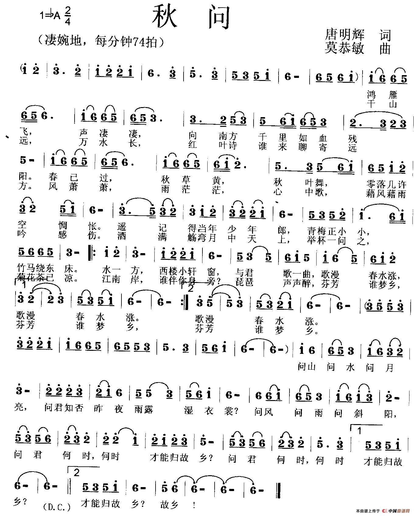这是曲作者为荣获《歌曲》杂志举办的2014年全国词曲新作最高奖《晨钟奖》的歌词《秋问》谱写的歌曲。曲子较为伤感。李红首唱。
