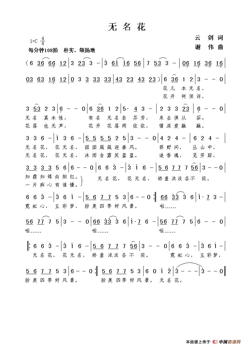 关于《无名花(云剑词 谢伟曲)》曲谱的评论