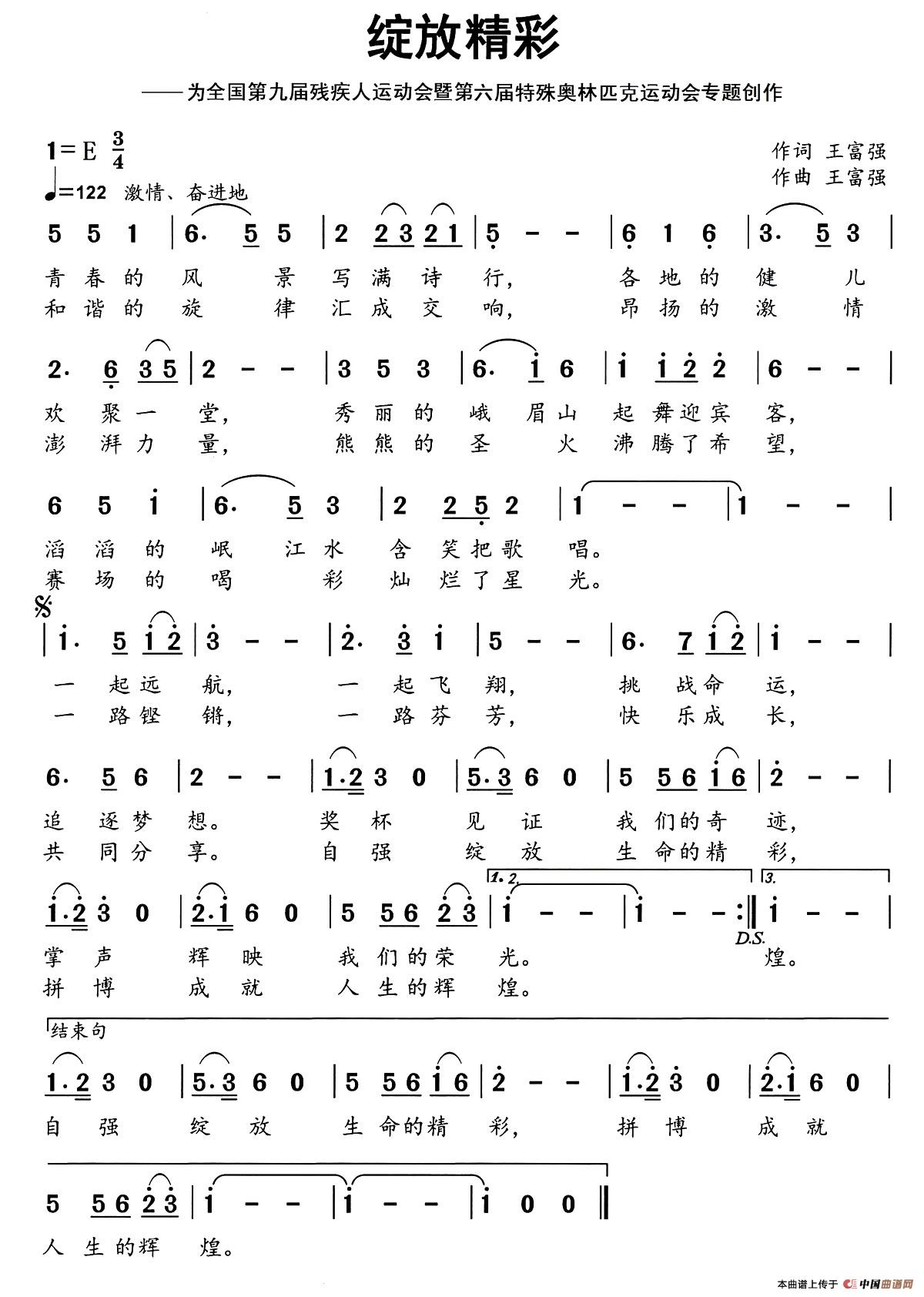 中华人民共和国第九届残疾人运动会暨第六届特殊奥林匹克运动会于2015年9月12日至19日在四川举行。“一路铿锵,一路芬芳,快乐成长,共同分享,自强绽放生命的精彩,拼搏成就人生的辉煌……”《绽放精彩》(王富强词曲)是王富强先生应邀专门为全国第九届残运会暨第六届特奥会策划创作的的歌曲。这里上传的是由王富强先生担任总策划,王富强先生作词、王富强先生作曲、众明星演唱的《绽放精彩》歌谱。