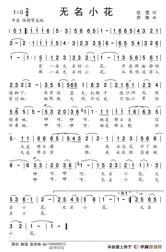 作词:任雪   作曲:亦弛   演唱(奏):张亦弛   来源:张亦弛原创 制谱   上传:咪迷米张亦弛   日期:2015-10-12   浏览次数: