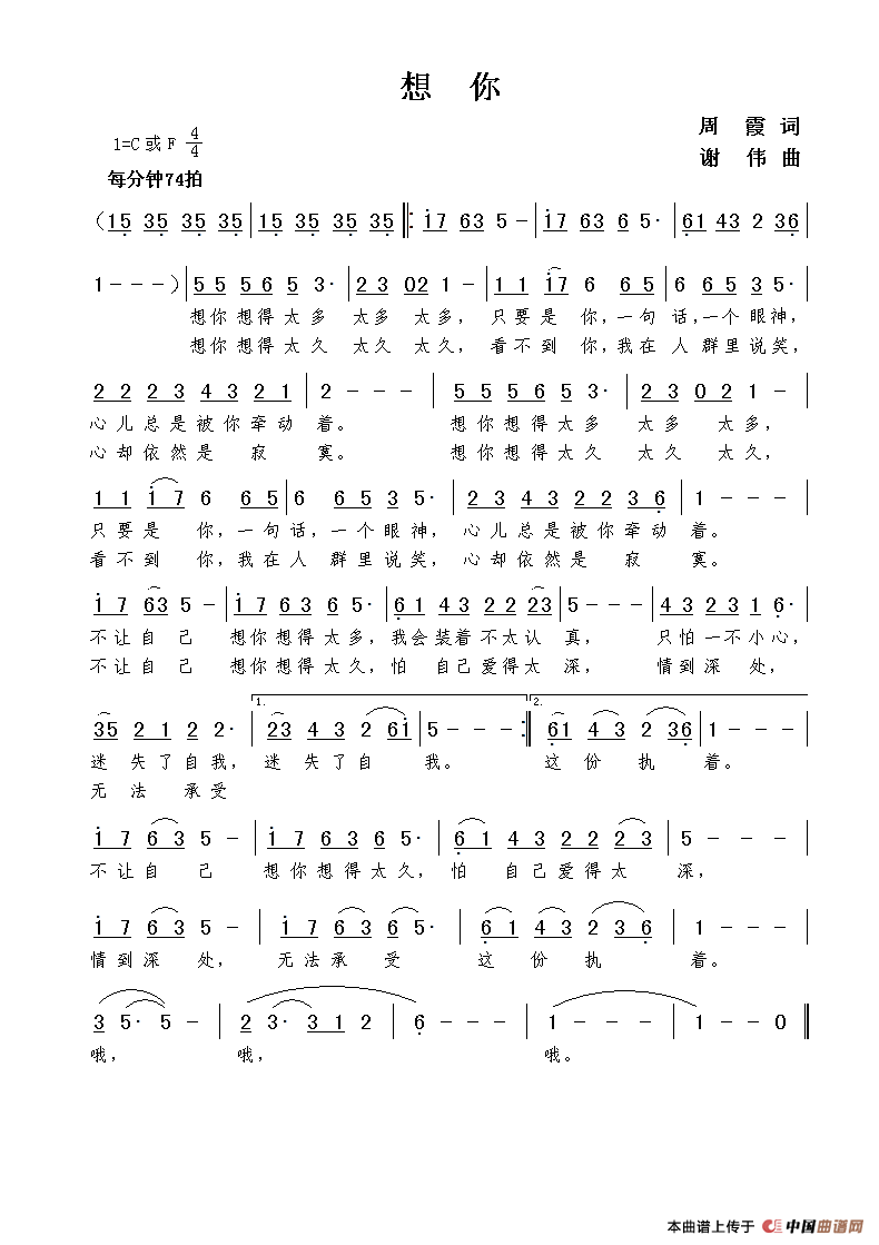 关于《想你(周霞词 谢伟曲)》曲谱的评论