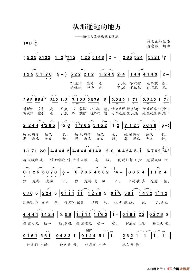 第二次是1996年3月14日上午,《哈密报》刘宗尧编辑赶来“钻石宾馆”,说:“黄老师,告诉你一个不幸的消息,王洛宾老师今天零时40分在乌鲁木齐去世了,你应该写首歌曲悼念大师。”我泪眼依稀,往事心头,凝情笔端,当日下午写成,即今春获奖的《从那遥远的地方》。我又写了悼文,火化给了老师的在天之灵,其中写道:“你去了,从坎坷中走来,又依恋地去了。幸好您的两千件作品还在,还将鼓舞我们去创造幸福的生活,去追求甜蜜的爱情。”六年来,我们还兴致依然地歌唱他的作品,我又五次去了新疆,发现那里的各族人民仍然陶醉在那好动人、好牵情的韵味之中:那掀起盖头时的惊喜;那皮鞭轻轻抽在身上的惬意;那半个月亮爬上来偷窥窗口的切情;那滚下山坡来“哎哟哟”的舒服;还有大板城姑娘长长的辫子和真漂亮的眼睛……都在他们的歌唱中用心去感受。