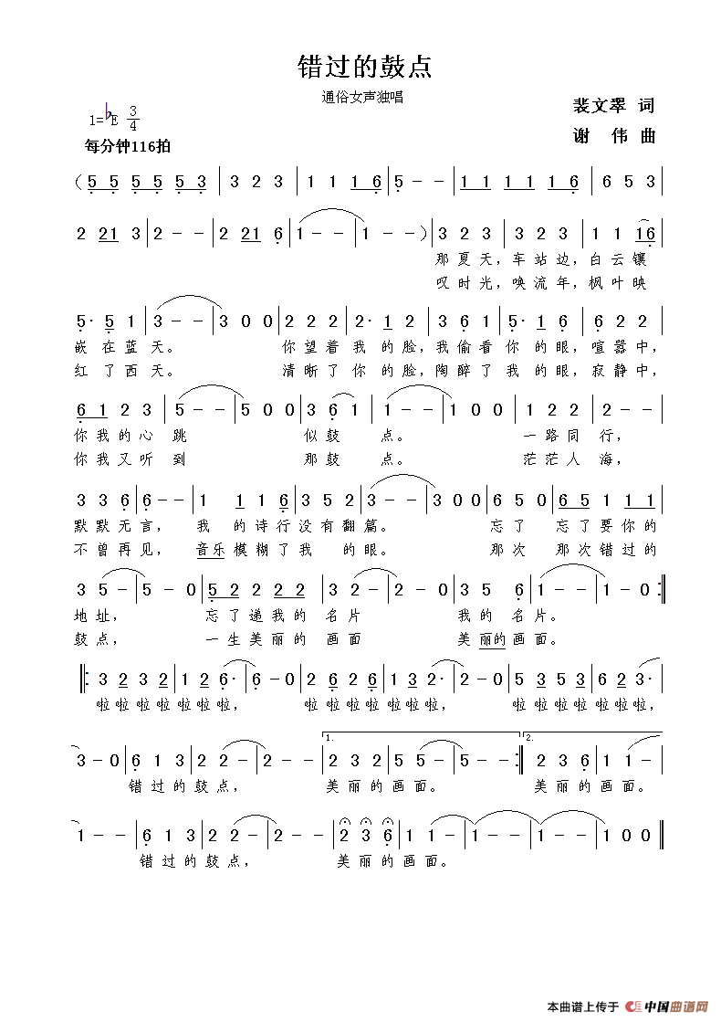 关于《错过的鼓点(裴文翠词 谢伟曲)》曲谱的评论