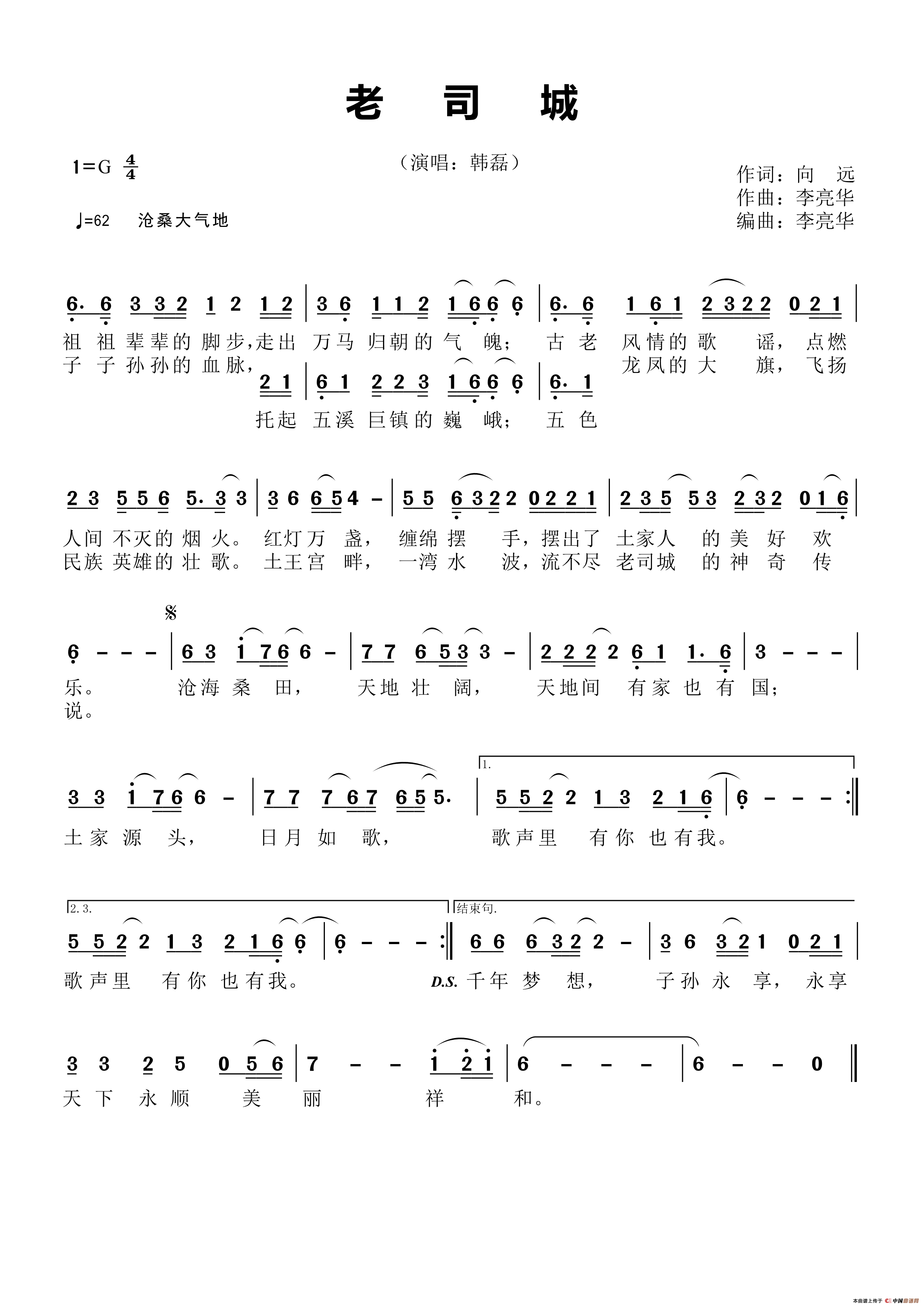 《老司城》歌曲是为湖南首个世界文化遗产老司城遗址而写,歌曲古朴厚重,具有历史深邃感和沧桑感。通过对彭氏治理时期土家人开疆拓土、繁衍生息、生产劳作、生活习俗的“拾撷”,以及家国情怀元素的植入,多元构筑和“成像”了老司城的前世今生。同时,在一缕缕“厚重、沧桑、赞颂、自豪”词意情绪的流淌中,向世人徐徐地展开了一幅幅民族风情的画卷,一组组民族神奇的密码和一段段岁月的波澜壮阔,呈现出老司城作为土家源头灿烂悠久的历史文化和留给子孙永享的宝贵精神财富。
