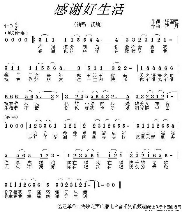 作词:张国强   作曲:蒋舟   演唱(奏):汤灿   格式:简谱   来源:蒋舟(作曲)原创上传   上传:蒋舟新乐坊   日期:2011-01-05   浏览次数: