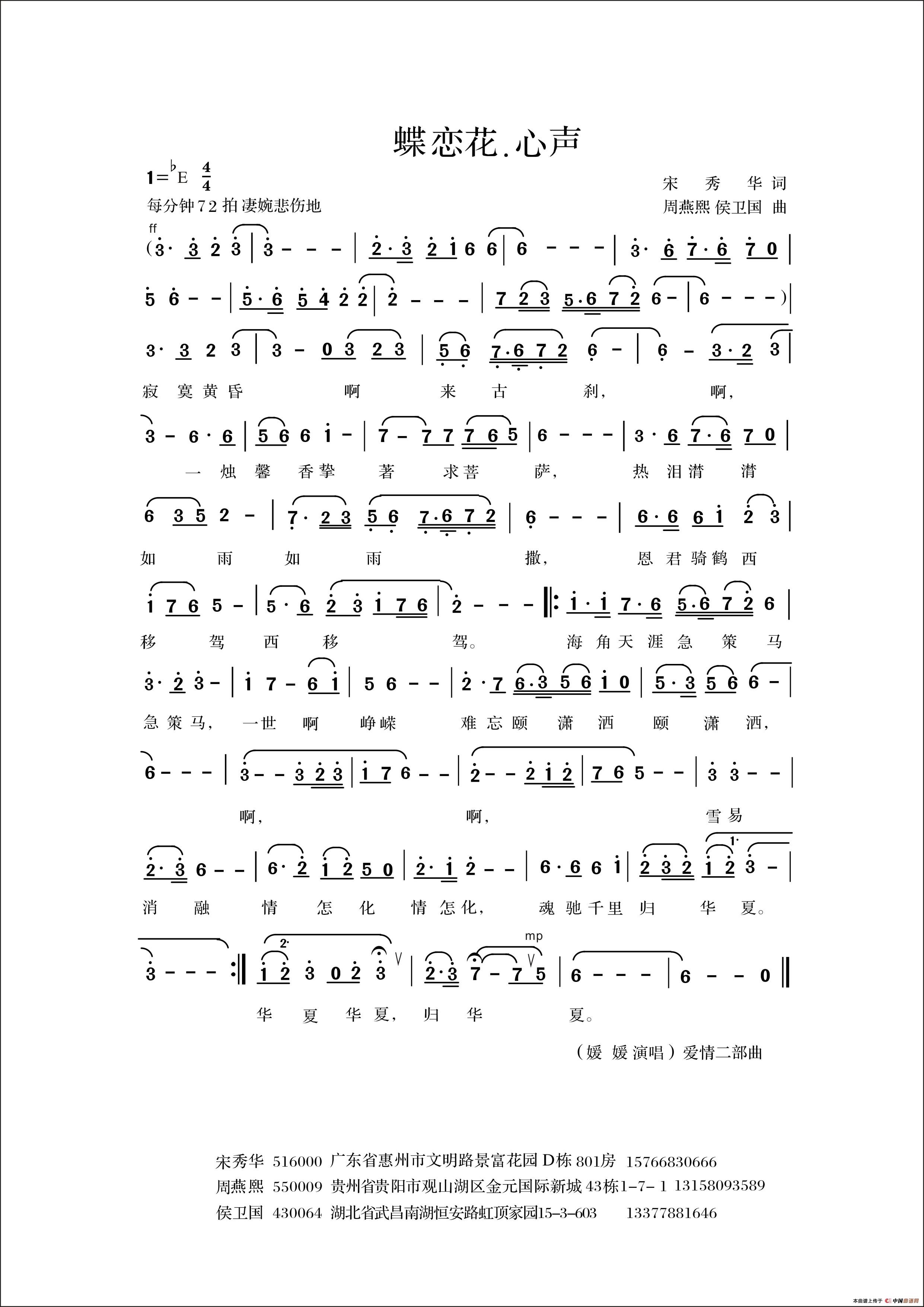 【《蝶恋花.心声》剧情简介】《蝶恋花.心声》是词作家宋秀华继《蝶恋花.长相思》后,推出的爱情二部曲,赞美和讴歌了一段恩爱夫妻风雨患难生死离别的爱情故事。这是富有人生观的“生命相许”灵魂深处的魂牵梦萦,灵魂永相厮守的旷世爱情,这种爱是和青春、赤诚以及对美好人生的执著追求深刻联系在一起的长相守。