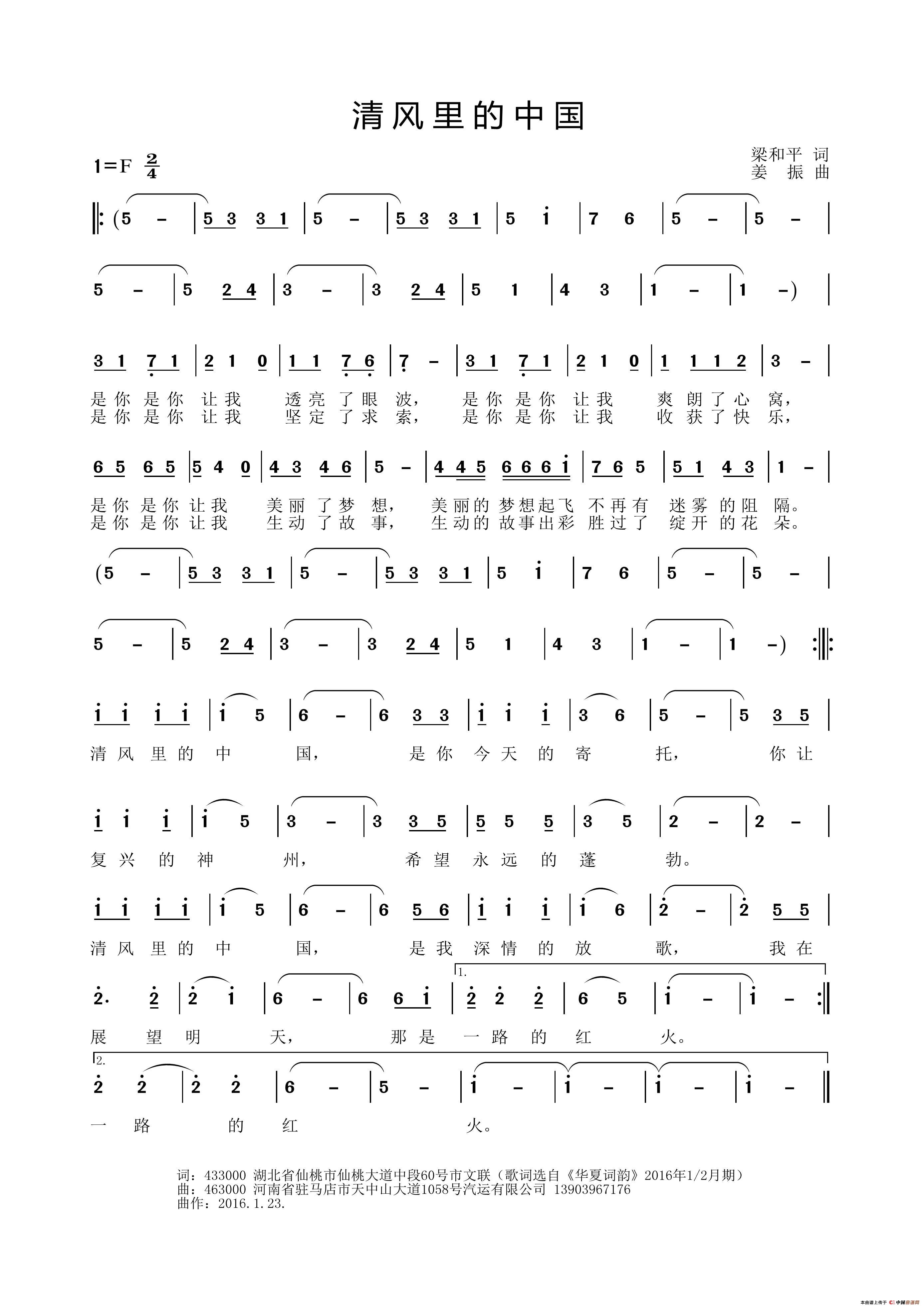 作词:梁和平   作曲:姜振   来源:谱友姜振上传   上传:姜振   日期:2016-08-19   浏览次数: