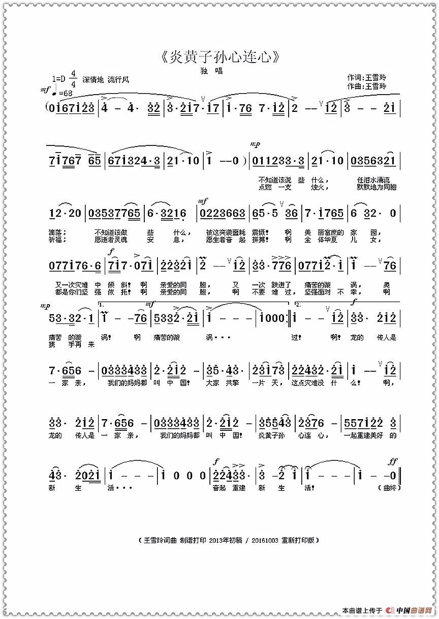 这首歌是在2013年汶川大地震时为声援灾区同胞赶写的一首赈灾专题歌曲。(流行风·独唱/王雪玲词曲·制谱打印·钢琴弹唱简易小样·原创)---谢谢老师们浏览聆听。