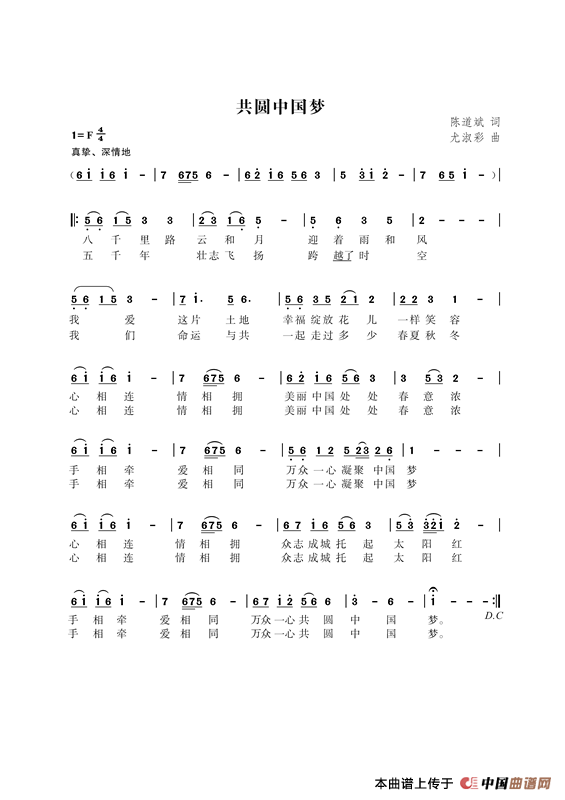 《共圆中国梦》这首是中国人民解放军海政文工团创研室陈道斌作词,女作曲家尤淑彩作曲的,由军旅男高音歌唱家,中国人民解放军广东省武警总队文工队队长黄志强演唱。黄志强2004年荣获全国青年歌手大赛民族组冠军。作曲家尤淑彩擅长民族歌曲的作曲,歌曲大气、抒情、优美、深情。该歌曲是由著名词作家陈道斌作词、著名作曲家尤淑彩谱曲,歌词大气磅礴、朗朗上口,旋律优美动听、婉转悠扬。歌曲从浩浩中华源远流长的文化中汲取精华,随着旋律的放大到整个国家的发展追求,又从国家的发展到每一个中国人内心深处执着不变的对生活和民族梦想的美好追寻。