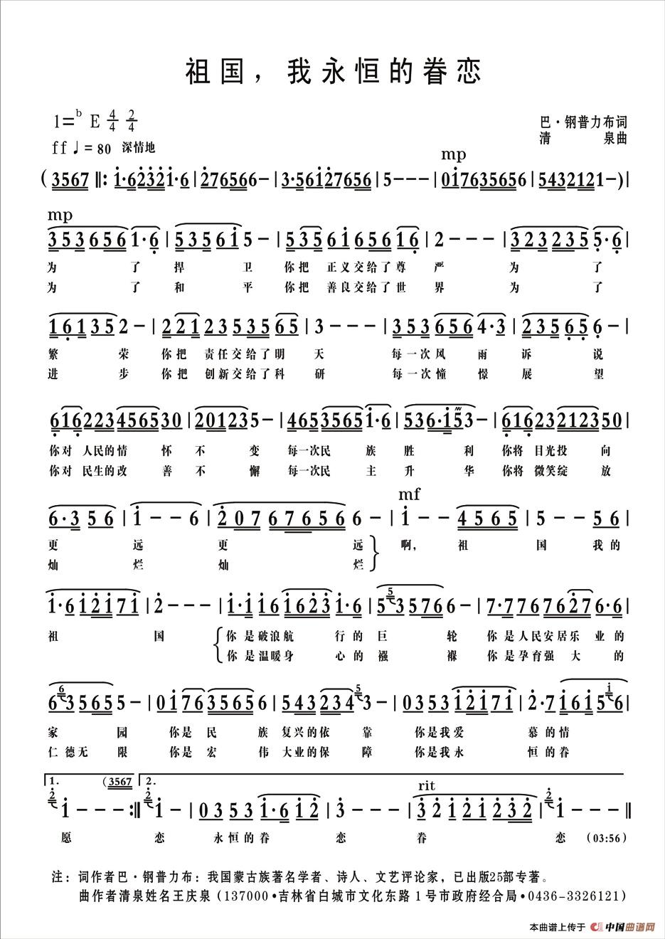 清泉歌曲作品《祖国,我永恒的眷恋》(巴·钢普力布词)是一首歌颂祖国的主旋律歌曲,全曲采用颂歌式音调,旋律宽广、气息绵长,有艺术歌曲气质,推荐用美声或民美风格(有美声功底的民族风格或有民族功底的美声风格)演唱。羽-宫交替调式,双主题带结束句的二段体结构。切分节奏型和垫音旋法的运用是本曲的一个特点。