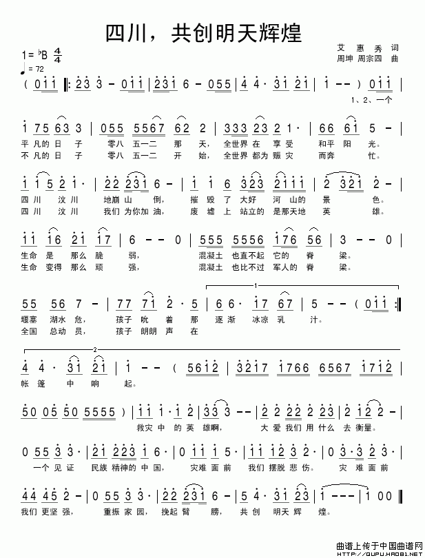 作词:艾惠秀   作曲:周坤、周宗四   格式:简谱   来源:艾惠秀(作词)原创上传   上传:艾惠秀   日期:2010-03-17   浏览次数: