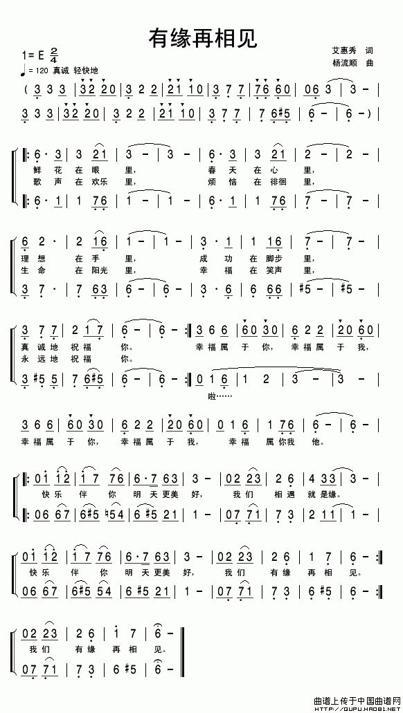 作词:艾惠秀   作曲:杨流顺   格式:简谱   来源:艾惠秀(作词)原创上传   上传:艾惠秀   日期:2010-03-17   浏览次数: