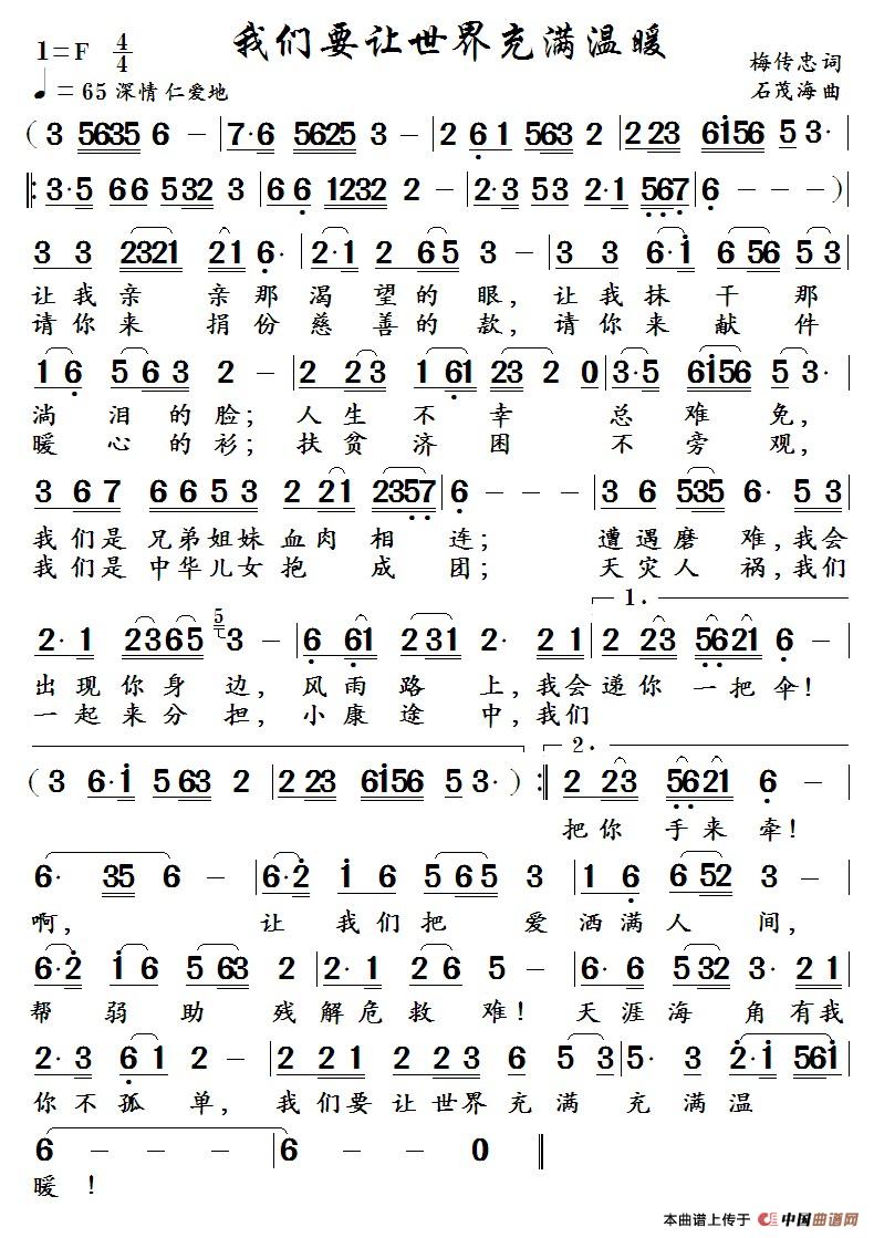 《 我们要让世界充满温暖 ( 梅传忠词 石茂海曲)》文本歌词