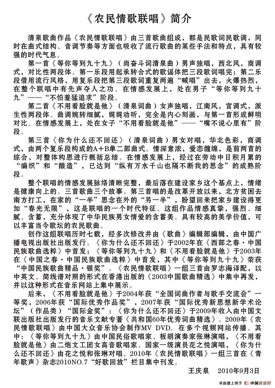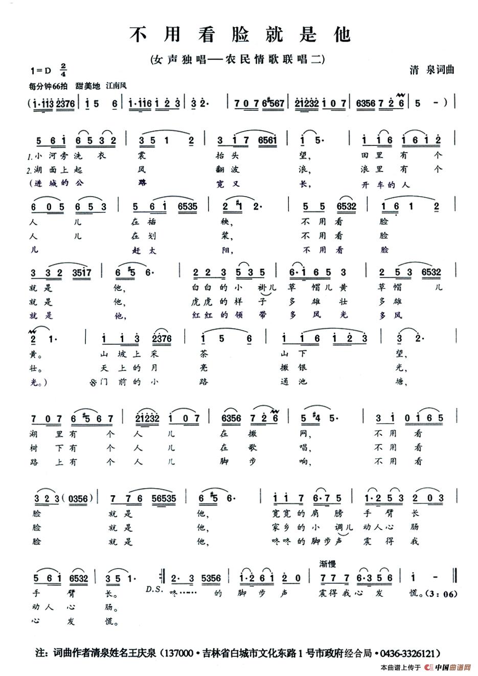 《不用看脸就是他》(清泉词曲)是清泉歌曲作品《农民情歌联唱》的第二首,已译成英文,有中英文简线谱对照版本在香港出版(《2003中国歌曲精选》)。曾荣获“全国词曲作者与歌手交流会”一等奖、国际优秀作品奖、国际金奖及世界华人“共和国建国六十周年优秀成果”特别金奖。作者全资自费请二炮文工团女高音歌唱家、国家一级演员花之悦演唱,曹廷编曲,中国大众音乐协会、北京文萃阁文化艺术中心制作CD、MTV,已在中国音乐著作权协会注册,本人拥有版权。花之悦的演唱清脆甜美、纯净明亮、字正腔圆、声情并茂、极富感染力!这首歌曲通篇没有一个“爱”字,却让人感到爱的那么深切,充分体现了中华民族男女情爱的含蓄美,具有很高的美学价值,得到国内外各方一致好评。社区在演唱,女白领也在传唱,网上的点击率很高。