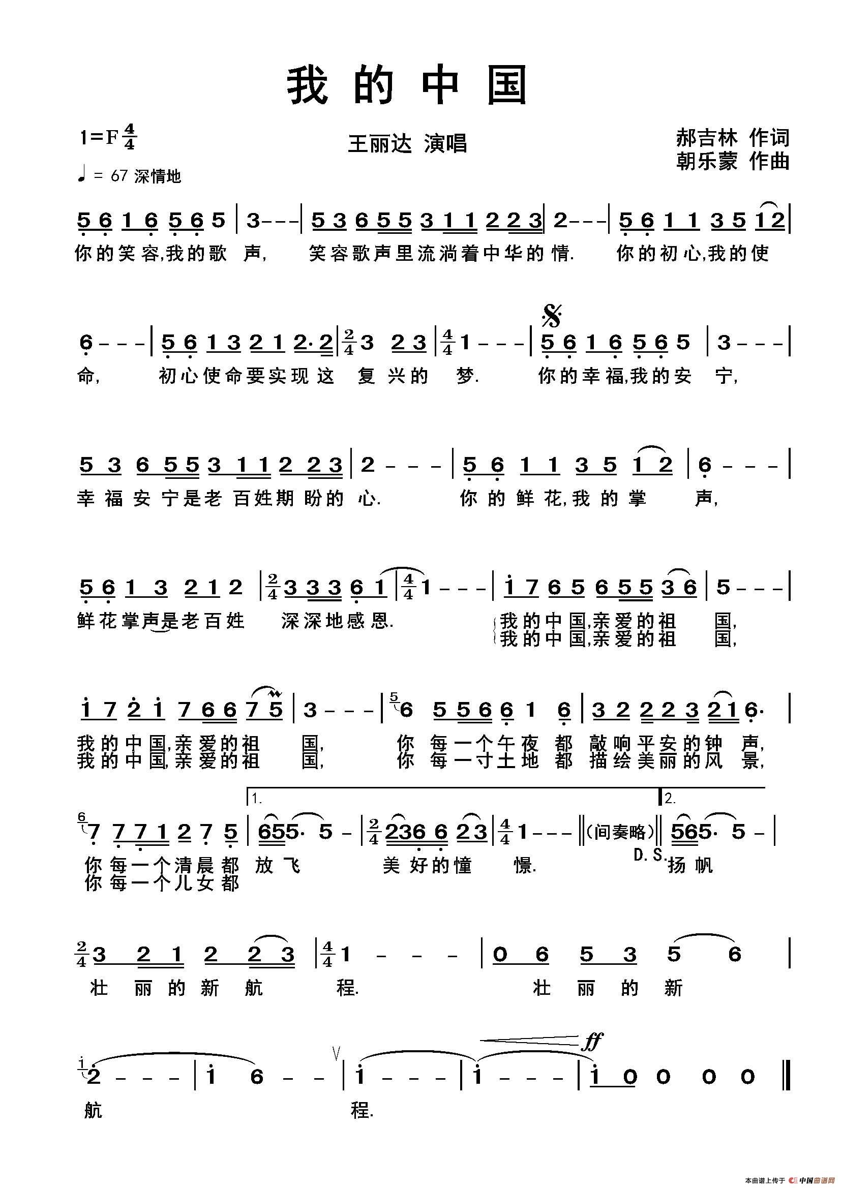 歌曲《我的中国》由著名军旅作曲家朝乐蒙作曲;著名词作家郝吉林作词;著名军旅女高音歌唱家王丽达演唱。