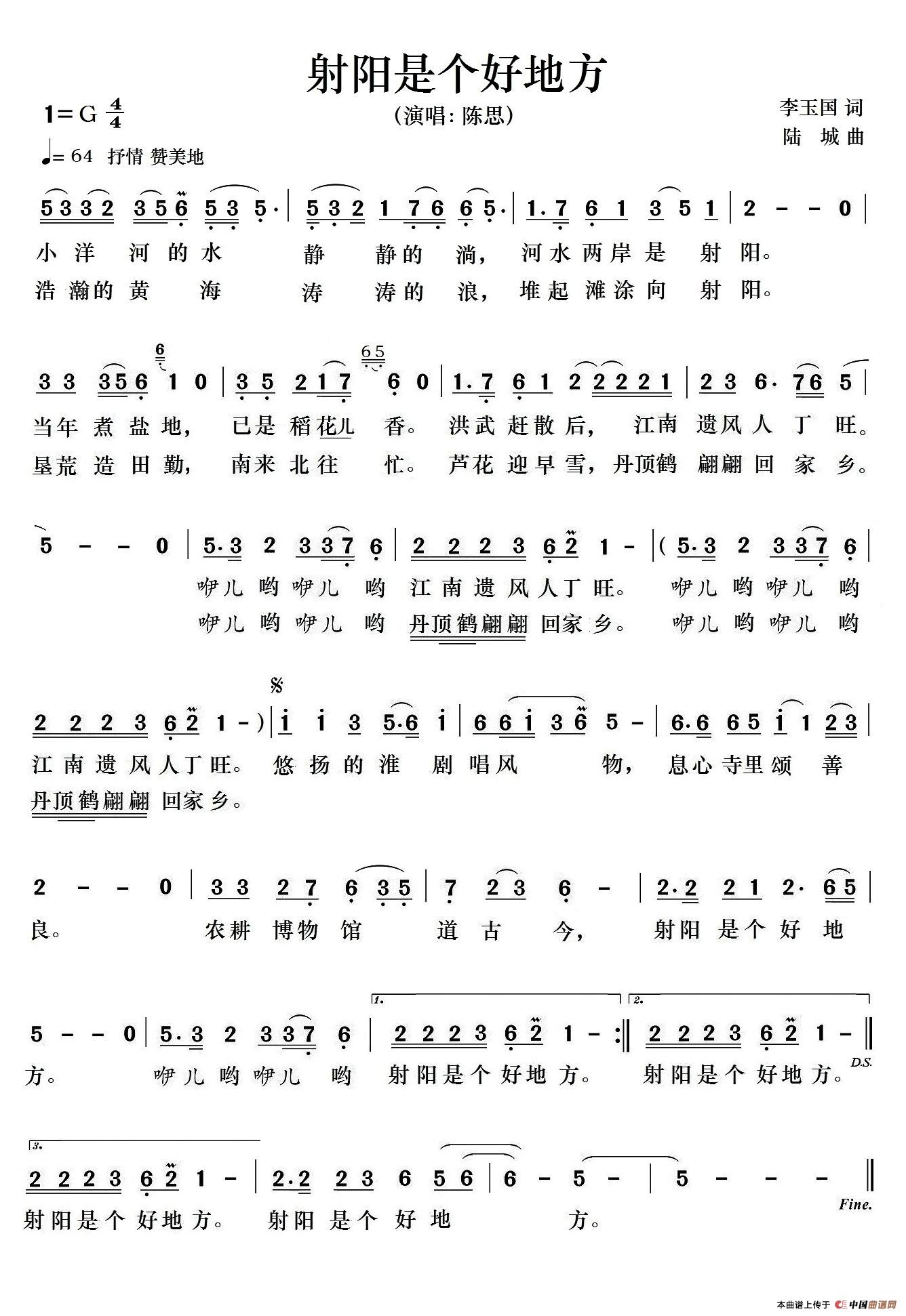 作词:李玉国 作曲:陆城 演唱:陈思