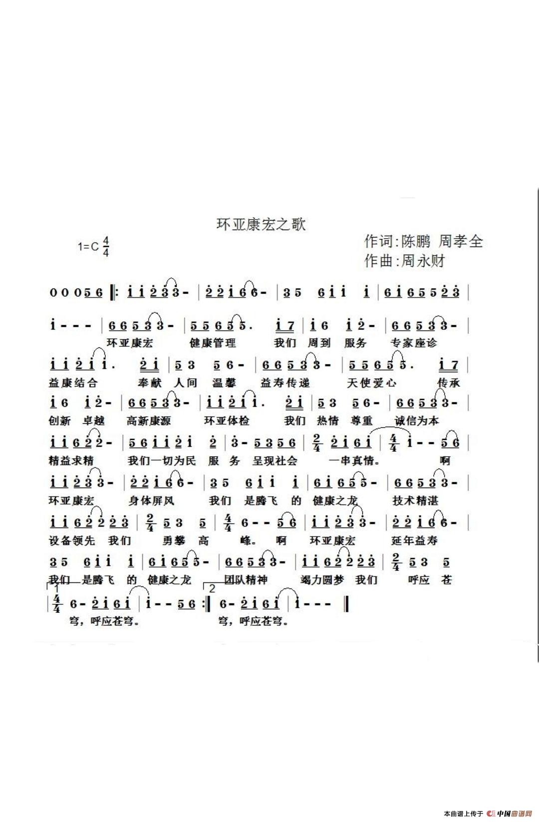 环亚康宏之歌 作词:陈鹏 周孝全 作曲:周永财 编曲:伍薪蓓 歌手: 王梓旭 环亚康宏 健康管理 我们周到服务 专家座诊 益康结合 奉献人间温馨 益寿传递 天使爱心 传承创新卓越 高新康源 环亚体检 我们热情尊重 诚信为本 精益求精 我们一切为民服务 呈现社会一串真情 啊 环亚康宏 身体屏风 我们是腾飞的健康之龙 技术精湛 设备领先 我们勇攀高峰 啊 环亚康宏 延年益寿 我们是腾飞的健康之龙 团队精神 竭力圆梦 我们呼应苍穹。