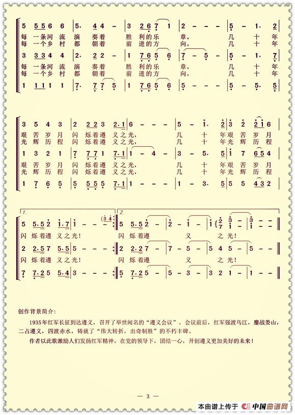 歌曲创作于90年代,为纪念”遵义会议“胜利召开60周年,毛主席诞辰100周年而作。由著名词作家万灵、简承国作词,著名作曲家王志敏、周明仁作曲,贵州人民广播电台合唱团录制,曾由中央电视台8频道播出。