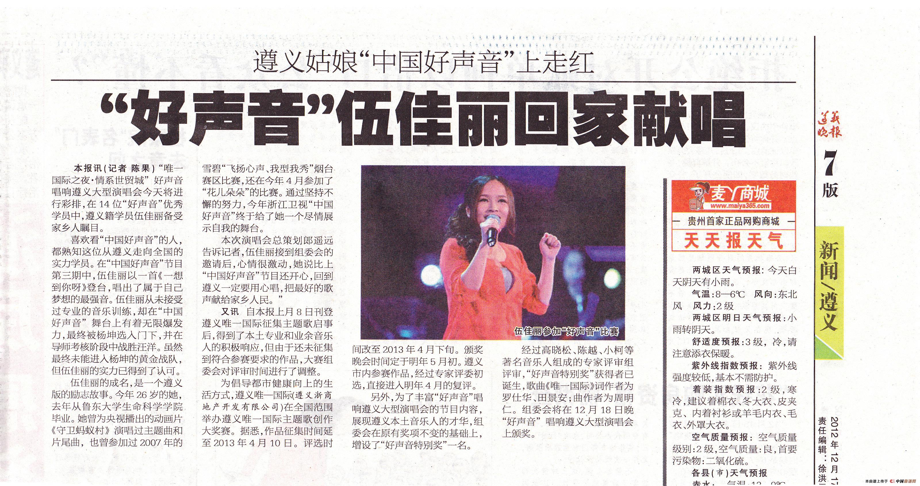 【唯一国际】主题歌创作大奖赛应征歌曲,经著名音乐人高晓松、陈越、小柯等人组成的专家评审组评审(2012年12月18日唯一国际之夜,中国好声音唱响遵义大型演唱会上揭晓,歌曲获中国好声音特别奖。)