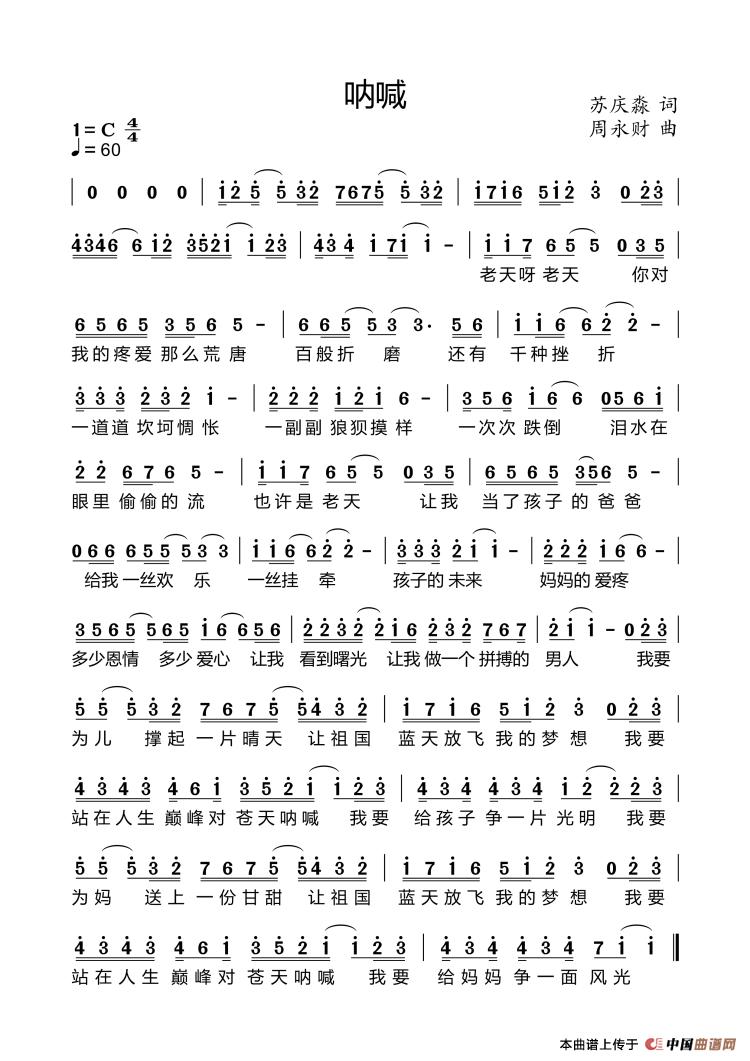 呐喊 词:苏庆淼 曲:周永财 老天呀老天 你对我的疼爱那么荒唐 百般折磨还有千种挫折 一道道坎坷惆怅 一副副狼狈摸样 一次次跌倒 泪水在眼里偷偷的流 也许是老天 让我当了孩子的爸爸 给我一丝欢乐一丝挂牵 孩子的未来妈妈的爱疼 多少恩情多少爱心 让我看到曙光 让我做一个拼搏的男人 我要为儿 撑起一片晴天 让祖国蓝天 放飞我的梦想 我要站在人生巅峰 对苍天呐喊 我要给孩子 争一片光明 我要为妈 送上一份甘甜 让祖国蓝天 放飞我的梦想 我要站在人生巅峰 对苍天呐喊 我要给妈妈 争一面风光