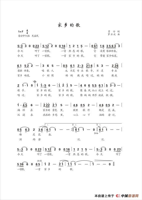 关于《家乡的歌》曲谱的评论