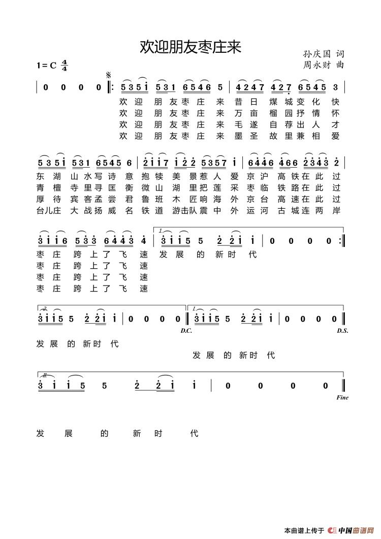欢迎朋友枣庄来 词:孙庆国 曲:周永财 欢迎朋友枣庄来 昔日煤城变化快 东湖山水写诗意 抱犊美景惹人爱 京沪高铁在此过 枣庄跨上了飞速 发展的新时代 欢迎朋友枣庄来 万亩榴园抒情怀 青檀寺里寻匡衡 微山湖里把莲采 枣临铁路在此过 枣庄跨上了飞速 发展的新时代 欢迎朋友枣庄来 毛遂自荐出人才 厚待宾客孟尝君 鲁班木匠响海外 京台高速在此过 枣庄跨上了飞速 发展的新时代 欢迎朋友枣庄来 墨圣故里兼相爱 台儿庄大战 扬威名 铁道游击队 震中外 运河古城连两岸 枣庄跨上了飞速 发展的新时代