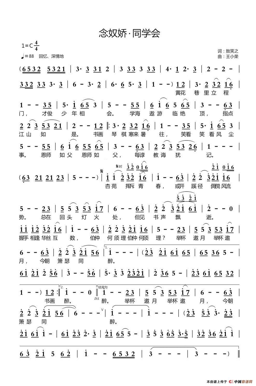 《念奴娇•同学会》由敖笑之作词、王小荣作曲演唱。我国知名书法家,享有“神州双管李”美誉的李远实先生为之挥毫题写歌名。《念奴娇•同学会》词作叙议结合,高度凝练,抚今追昔,情趣横生,借同窗之情,抒人生感悟,视野开阔,意境高远;曲谱演唱,或高亢激昂,宛如万马奔腾,激发奋斗豪情;或婉约低徊,仿若林泉汩汩,只想枕风沐月……词曲美合,同学美聚,唱响这首优美动听之歌,回忆往昔,感慨今朝,师生情、同学情,更加深厚而久远;且让我们“举杯邀月”,乘着歌声的翅膀,飞向更美好的明天!【点评人:刘建明(教授,萍乡学院图书馆馆长、原文学院院长)】