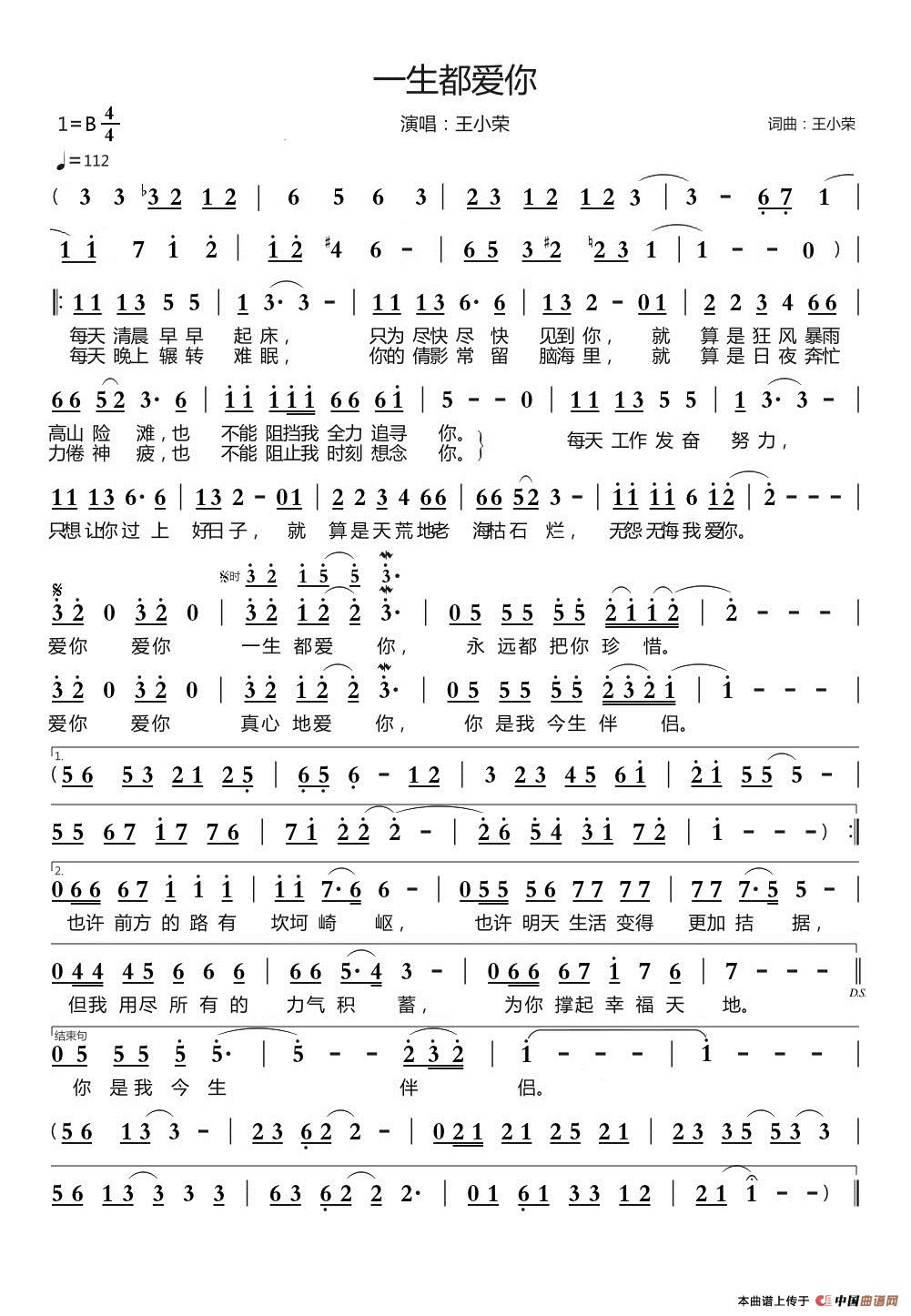 在七夕情人节即将到来之际,华语唱作歌手王小荣日前深情创作演唱了一首爱情赞歌——《一生都爱你》,并向QQ音乐、酷狗音乐、酷我音乐、网易云音乐、全民k歌、中国词曲网、中国曲谱网、腾讯网、优酷网、爱奇艺网、56网、搜狐网、今日头条、伴奏中国、KTV新歌网、好碟歌库网等音乐播放器和网站及全国众多点歌系统、卡拉OK歌厅发行投放,这也是王小荣2018年继制作发行《宜春我的家》《我在宜春遇见你》《我在人海中遇见你》《想你想得眼泪流》《沿着城市的边缘流浪》《港口》《可怜天下父母心》《心中的阿爸》《云中草原我可爱的家乡》《念奴娇•同学会》之后的第11首唱作歌曲。
