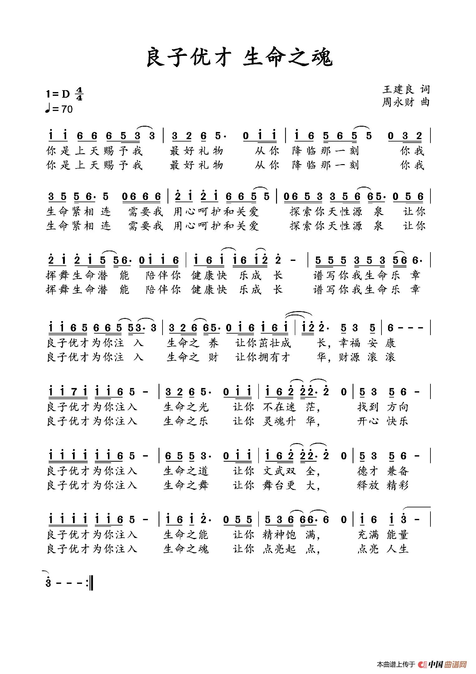 良子优才.生命之魂 作词:王建良 作曲:周永财 你是上天赐予我最好礼物 从你降临那一刻 你我生命紧相连 需要我用心呵护和关爱 探索你天性源泉 让你挥舞生命潜能 陪伴你健康快乐成长 谱写你我生命乐章 良子优才为你注入生命之养 让你茁壮成长,幸福安康 良子优才为你注入生命之光 让你不在迷茫,找到方向 良子优才为你注入生命之道 让你文武双全,德才兼备 良子优才为你注入生命之能 让你精神饱满,充满能量 你是上天赐予我最好的礼物 从你降临那一刻 你我生命紧相连 需要我用心呵护和关爱 探索你天性源泉 让你挥舞生命潜能 陪伴你健康快乐成长 谱写你我生命乐章 良子优才为你注入生命之财 让你拥有才华,财源滚滚 良子优才为你注入生命之乐 让你灵魂升华,开心快乐 良子优才为你注入生命之舞 让你舞台更大,释放精彩 良子优才为你注入生命之魂 让你点亮起点,点亮人生