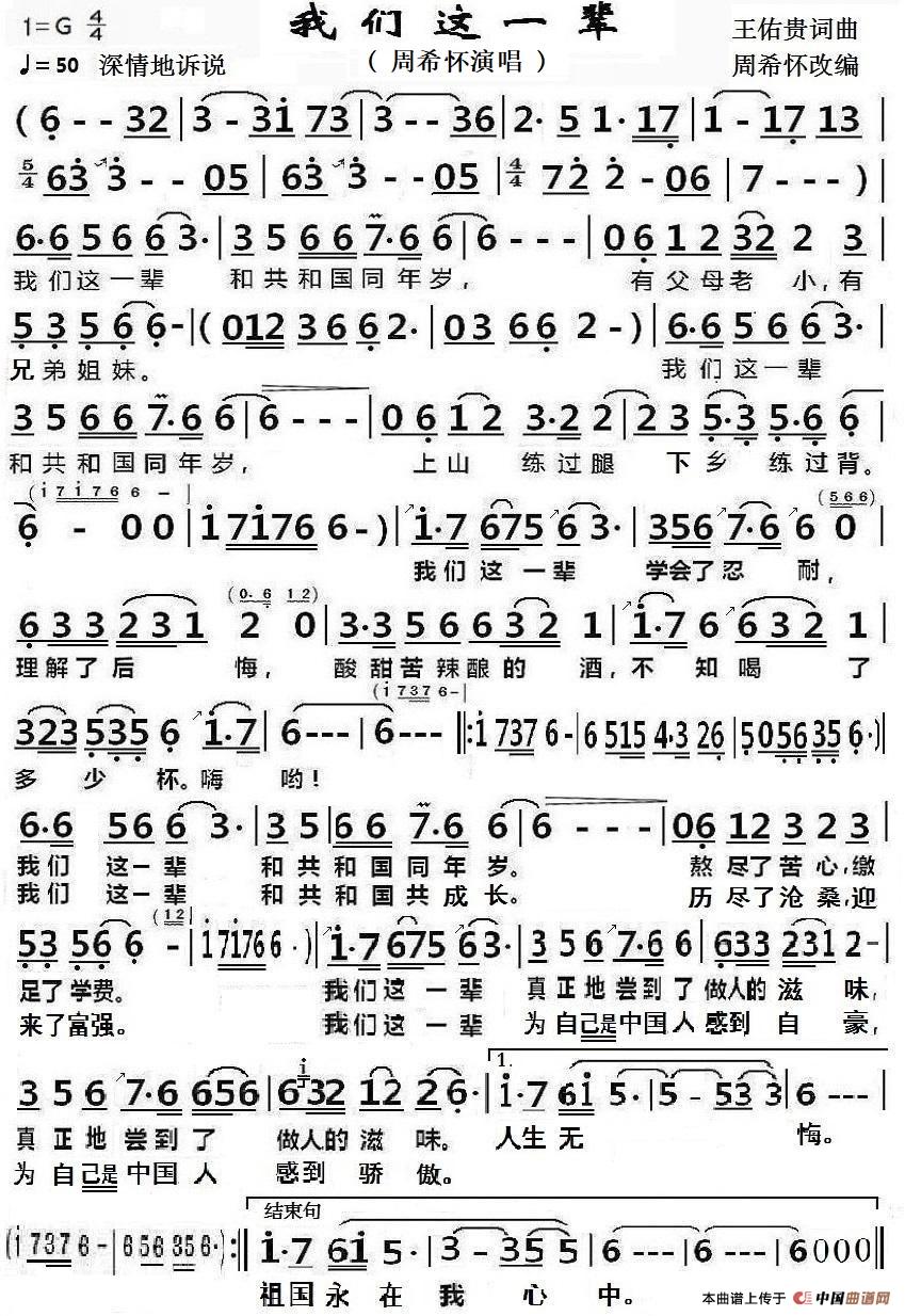 王佑贵老师创作的这首《我们这一辈》,歌曲曲调优美、激昂,歌词朗朗上口、饱含沧桑。是一首在全国音乐界得到好评,受到全国群众普遍喜爱并广为传唱的优秀歌曲。改编者在副歌增加了一段歌词,结束句旋律做了微调。意在表达我们共和国同龄人七十年来与祖国风雨同舟、历尽沧桑、同甘共苦,迎来了今天的国富民强;意在抒发我们这一辈子以自己是中国人感到自豪和骄傲之情,进一步激发祖国永在我心中的豪情。