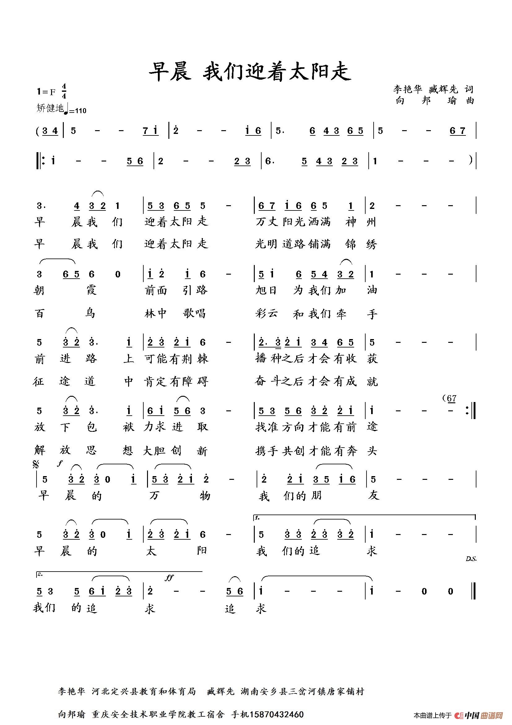 早晨我们迎着太阳走,万丈阳光洒满神州。朝霞前面引路,旭日为我们加油。