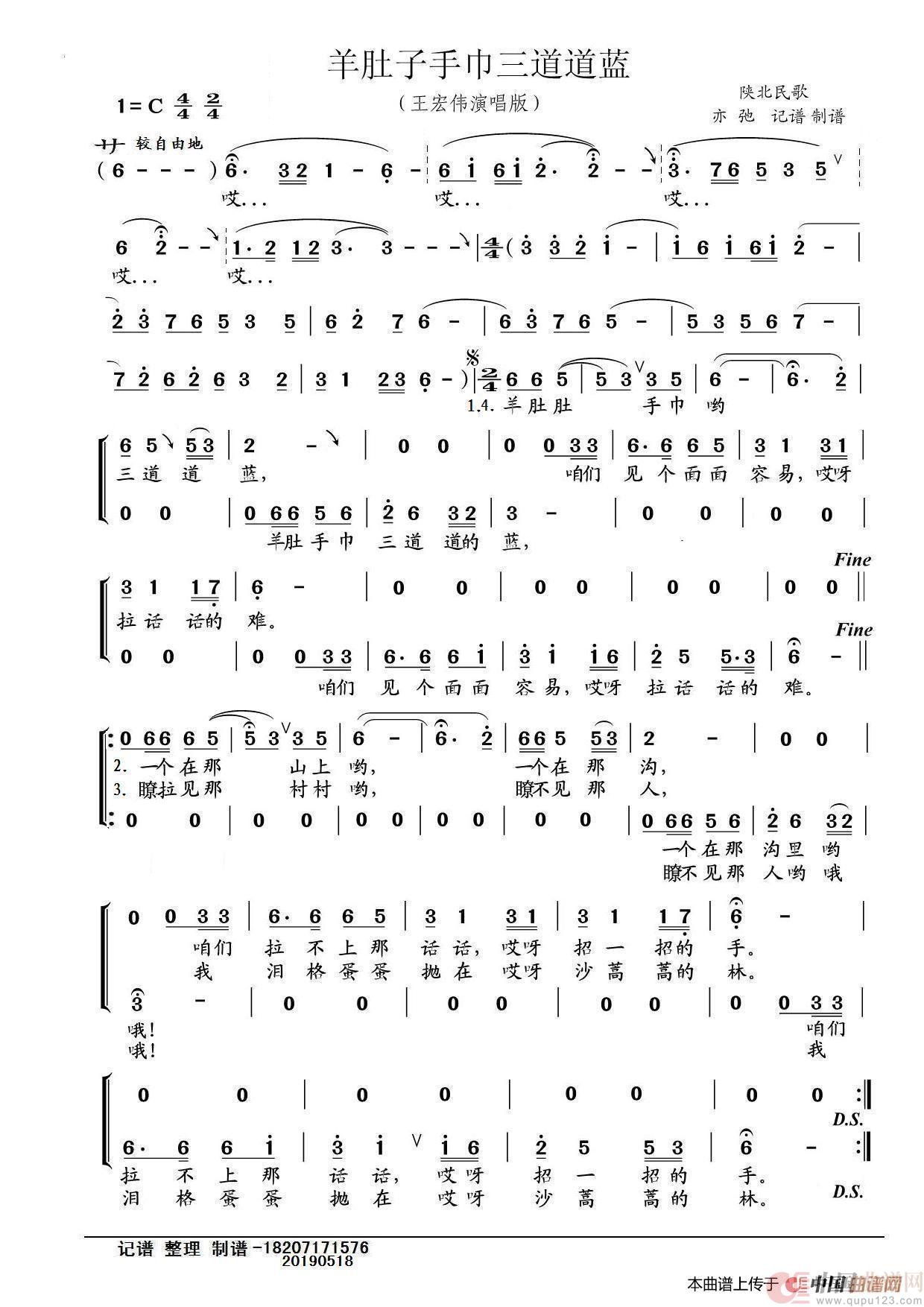 羊肚子手巾三道道蓝(亦弛记谱整理)(王宏伟演唱)(1)_原文件名:5ce26e773126b.jpg