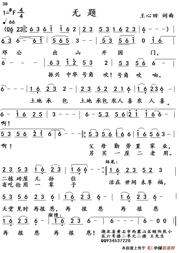 作词:王心田   作曲:王心田   演唱(奏):捕鱼人   来源:谱友捕鱼人QQ上传   上传:捕鱼人QQ   日期:2019-05-20   浏览次数:
