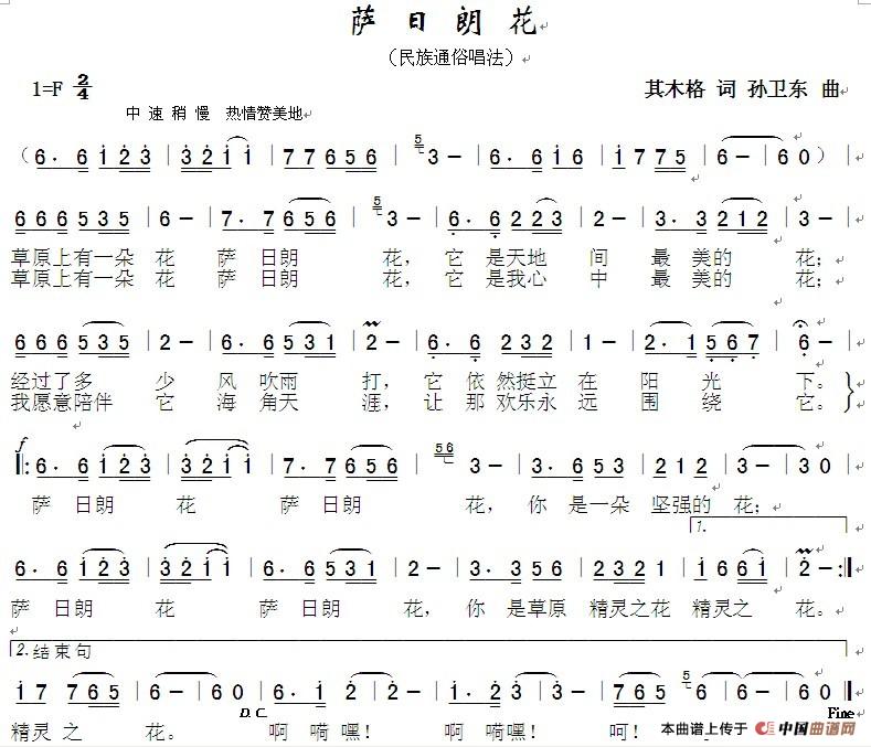 关于《萨日朗花(其木格词孙卫东曲)》曲谱的评论