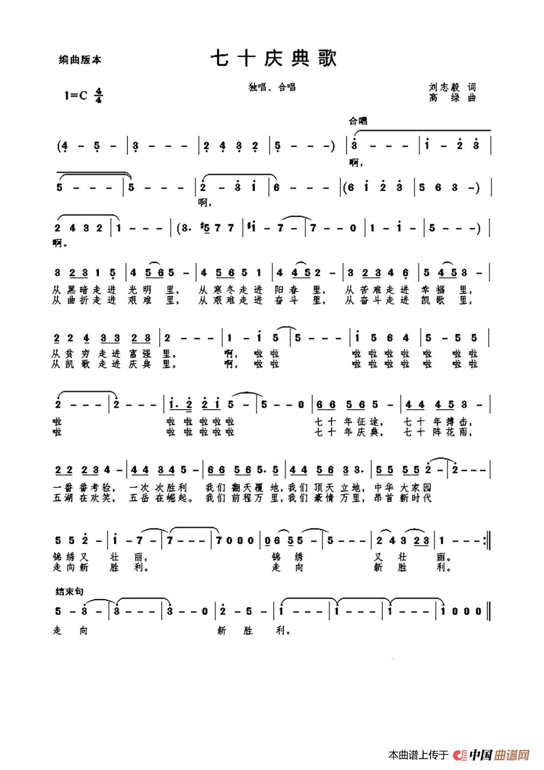 《七十庆典歌》属于颂歌题材,音乐必须大气雄伟,蓄銳凝聚,深情动人。歌词上下联,二段体,给出了结构,很自然地歌曲“屋架”就搭建起来了: 带副歌的二部曲式结构。