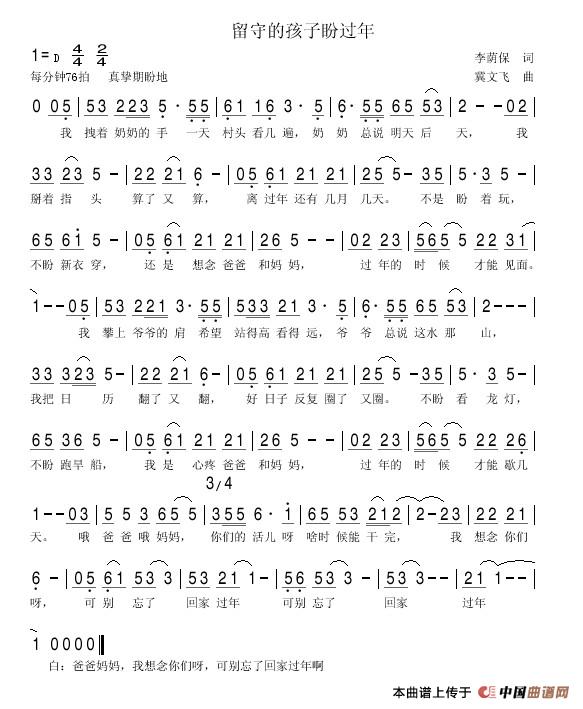 留守的孩子盼过年(李荫保词 冀文飞曲)(1)_原文件名:《留守的孩子盼过年》歌谱 李荫保词 冀文飞曲.jpg