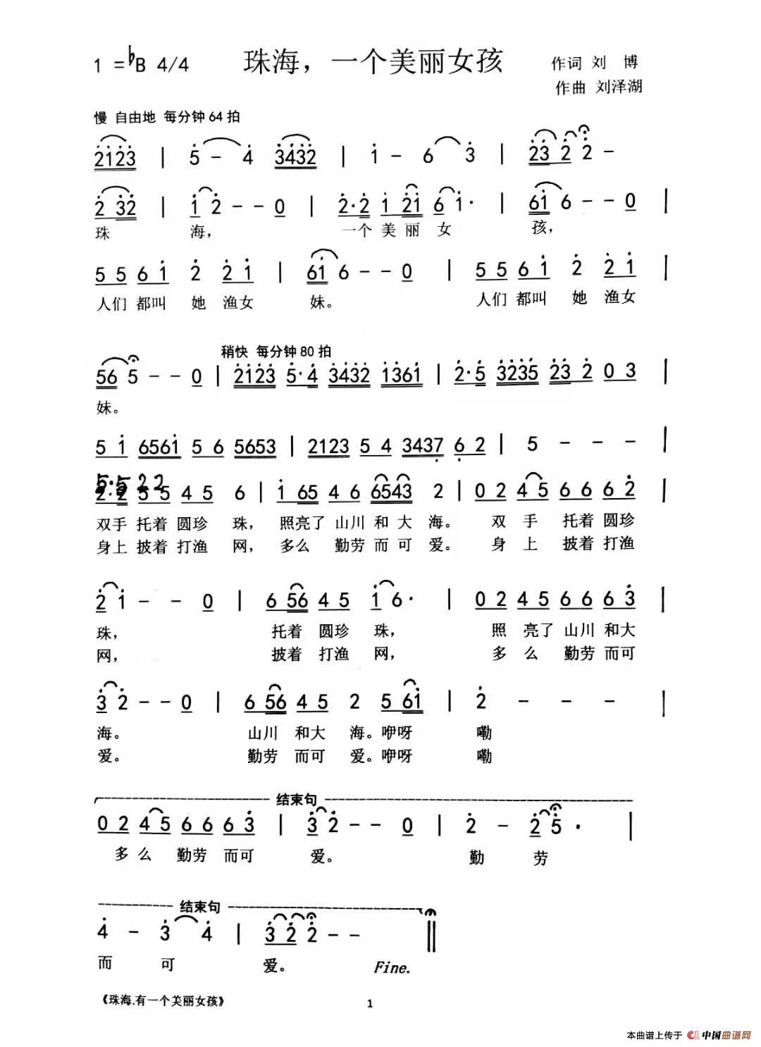 《珠海,一个神奇女孩》原来歌谱是美丽的女孩,现在所有美丽的形容词都改为神奇,歌谱来不及更改了,请见谅。