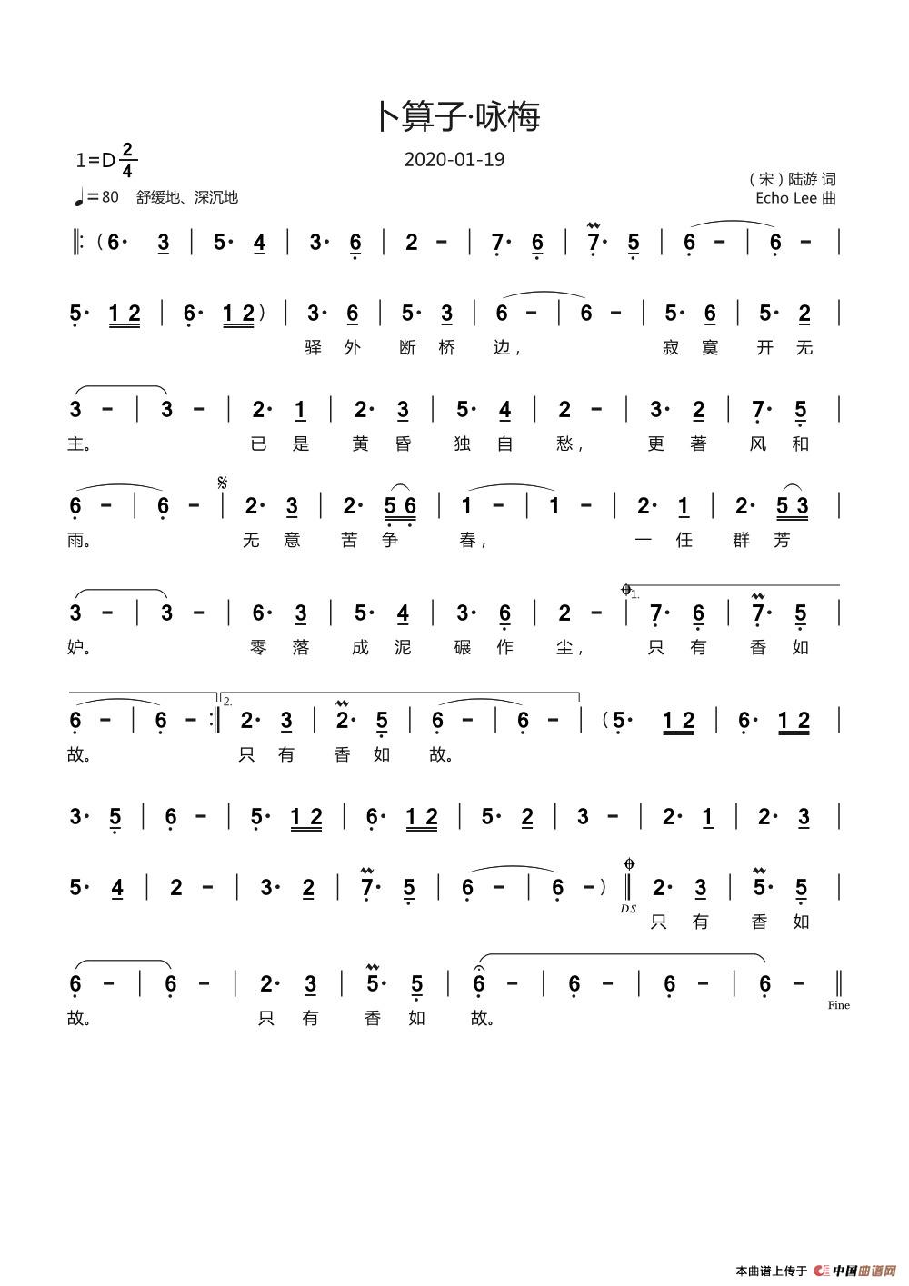 作词:(宋)陆游   作曲:Echo Lee   来源:谱友一门502上传   上传:一门502   日期:2020-01-20   浏览次数: