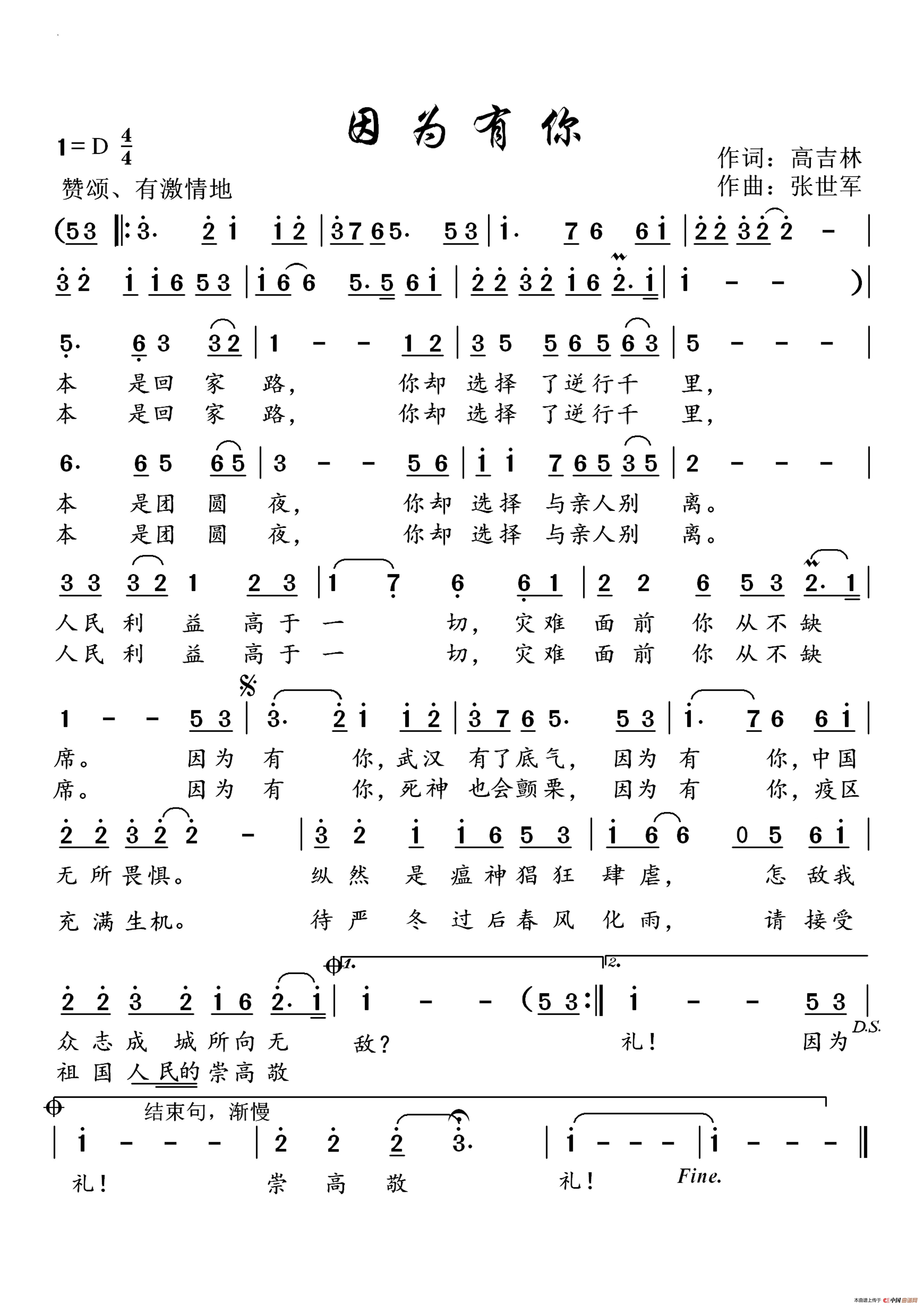 因为有你,中国无所畏惧;因为有你,死神也会颤栗。莫道浮云终蔽日严冬过尽绽春蕾。感谢战斗在抗疫前线的勇士们,向您们致敬!感谢高老师的好词,特别要感谢景广云老师的力荐和深情演绎,太走心了……感谢所有帮助和指导的老师们。