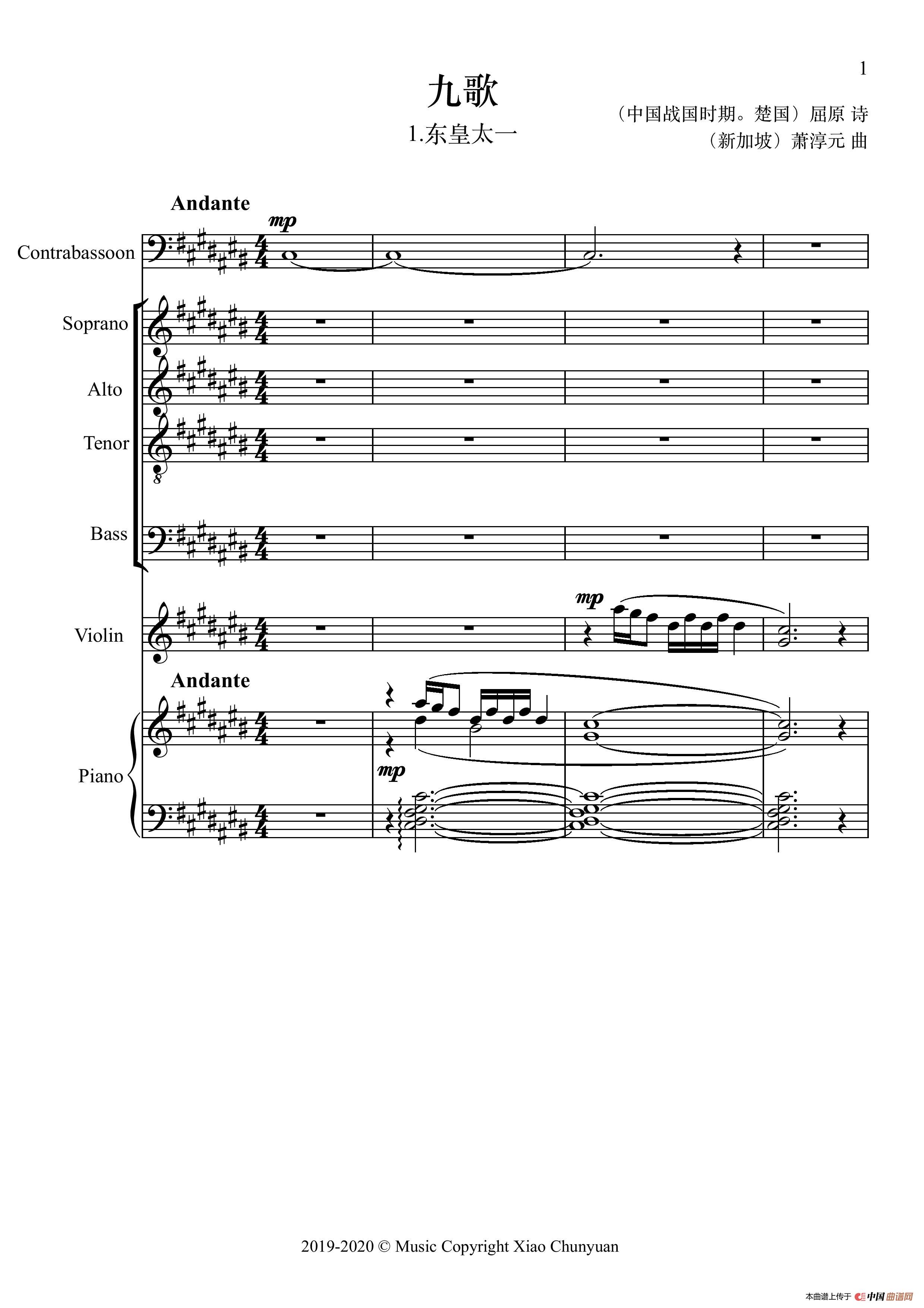 《九歌》是中国爱国诗人屈原的一代巨作。作曲家选了《九歌》中的头三首诗来谱。 以混声合唱或女高音独唱或女低音独唱,配塔低音巴松管,小提琴和钢琴演奏。 歌谱请下载 PDF。附总谱和分谱。