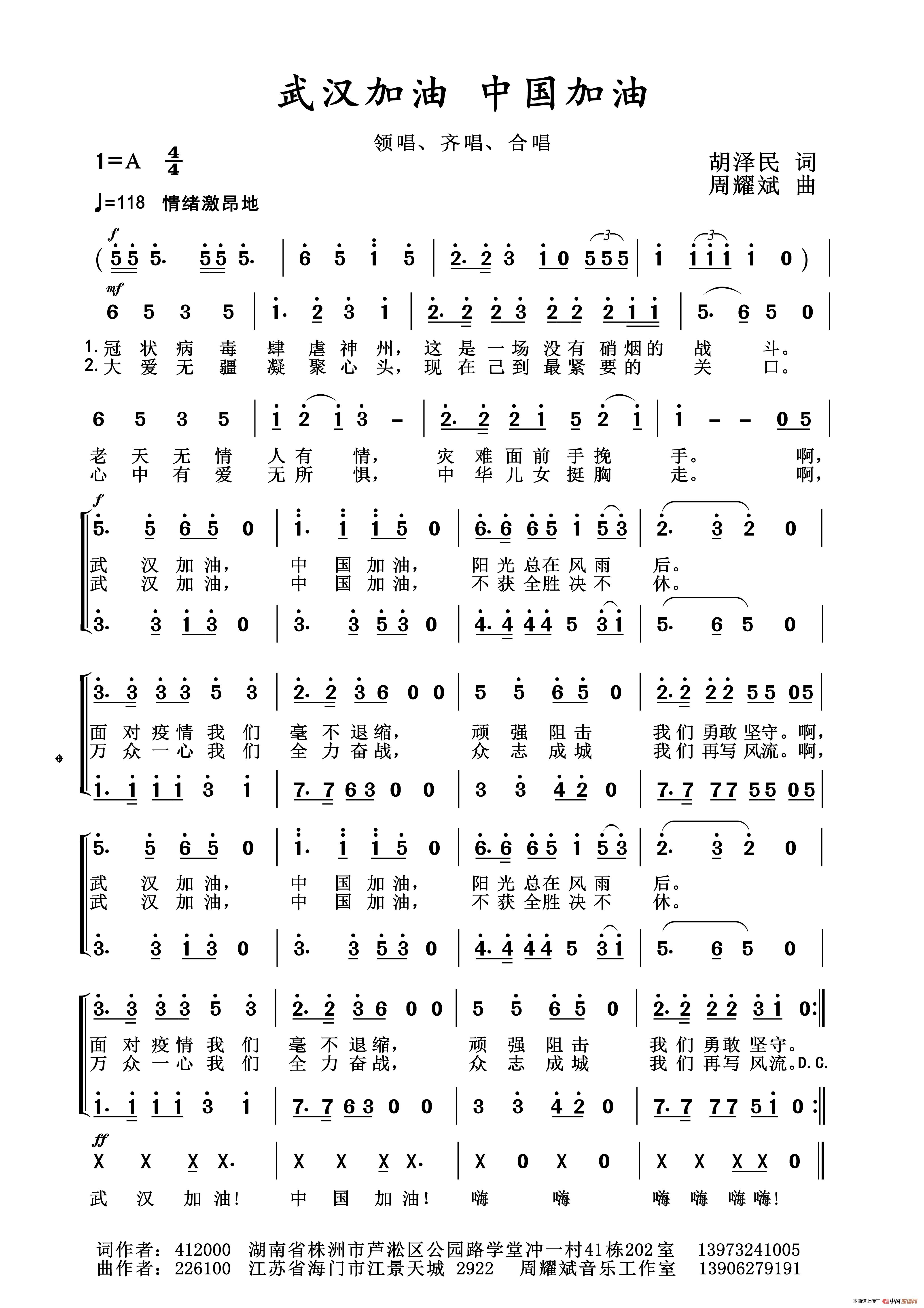 2020抗疫组歌《武汉加油中国加油》(胡泽民作词、周耀斌作曲)