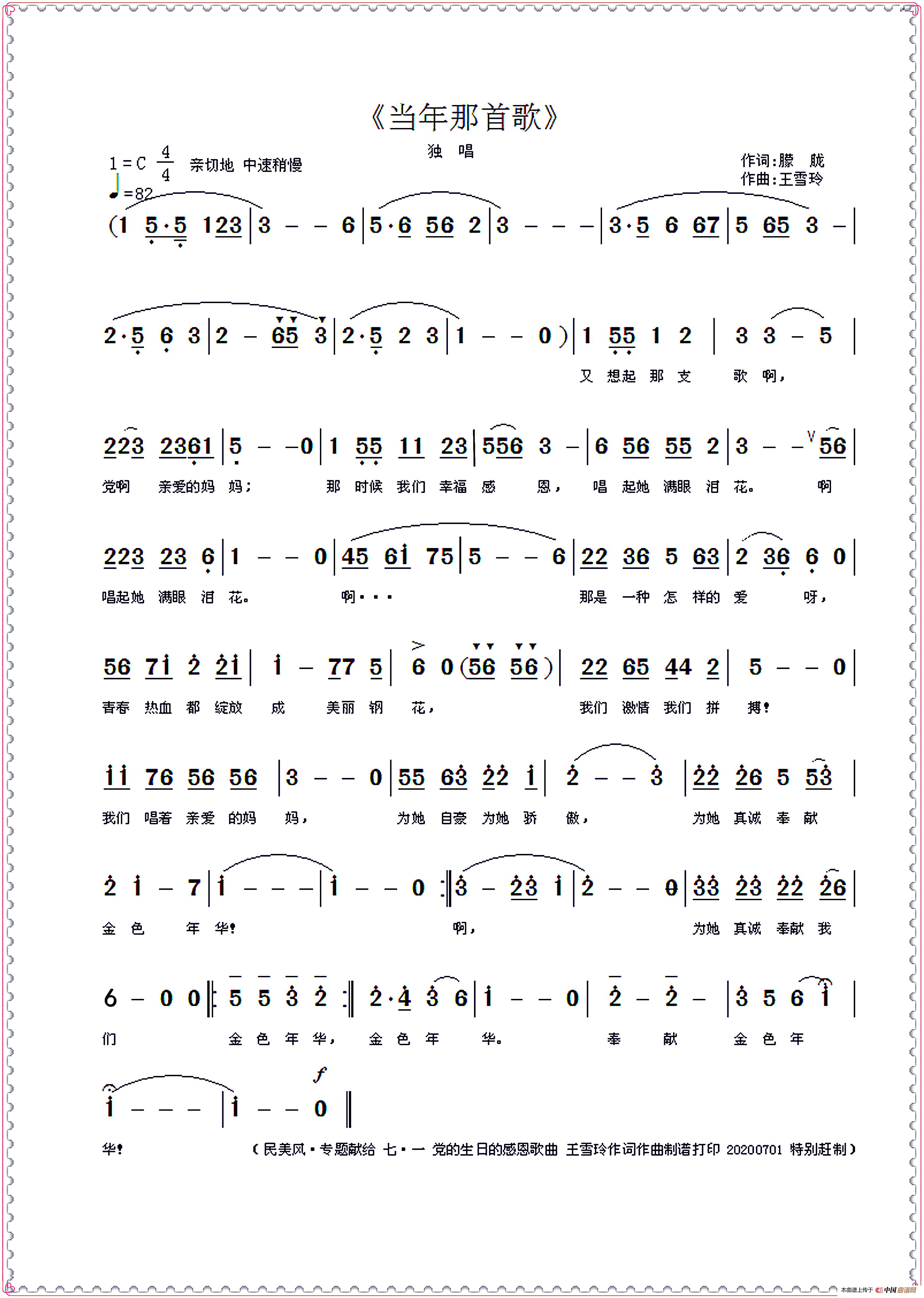 《当年那首歌》这是今天下午才决定的构思·赶制出来的专题献给党的生日的抒情歌曲--民美风/齐唱/王雪玲作词作曲制谱打印/原创。(歌曲已做好--待传网址)