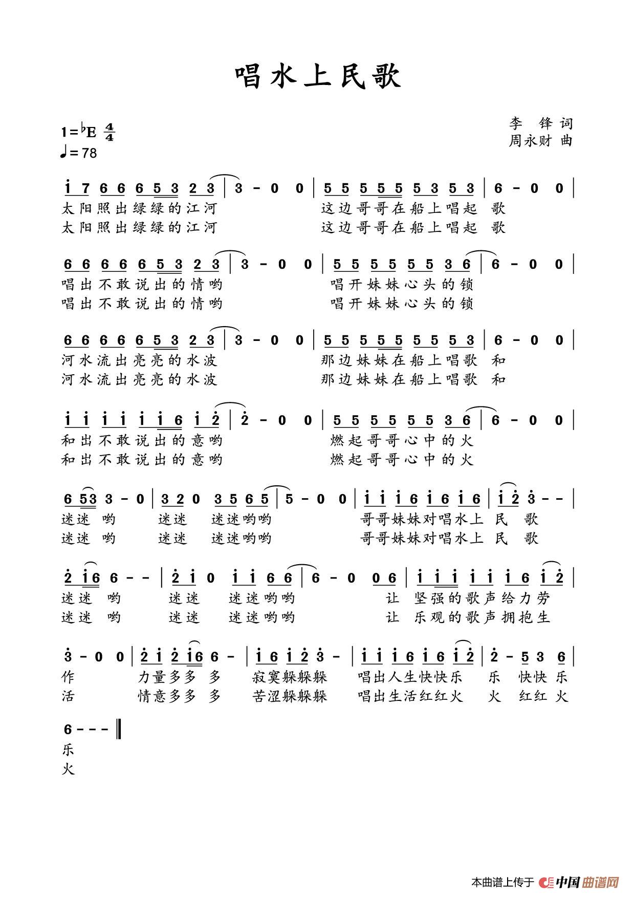 唱水上民歌 词:李锋 曲:周永财 太阳照出绿绿的江河   这边哥哥在船上唱起歌   唱出不敢说出的情哟 唱开妹妹心头的锁     河水流出亮亮的水波   那边妹妹在船上唱歌和   和岀不敢说出的意哟 燃起哥哥心中的火     迷迷哟  迷迷迷 迷哟哟  哥哥妹妹对唱水上民歌  迷迷哟  迷迷迷 迷哟哟  让坚强的歌声给力劳作 力量多多多  寂寞躲躲躲 唱出人生快快乐乐  快快乐乐     迷迷哟  迷迷迷 迷哟哟  哥哥妹妹对唱水上民歌  迷迷哟  迷迷迷 迷哟哟  让乐观的歌声拥抱生活 情意多多多  苦涩躲躲躲 唱出生活红红火火  红红火火