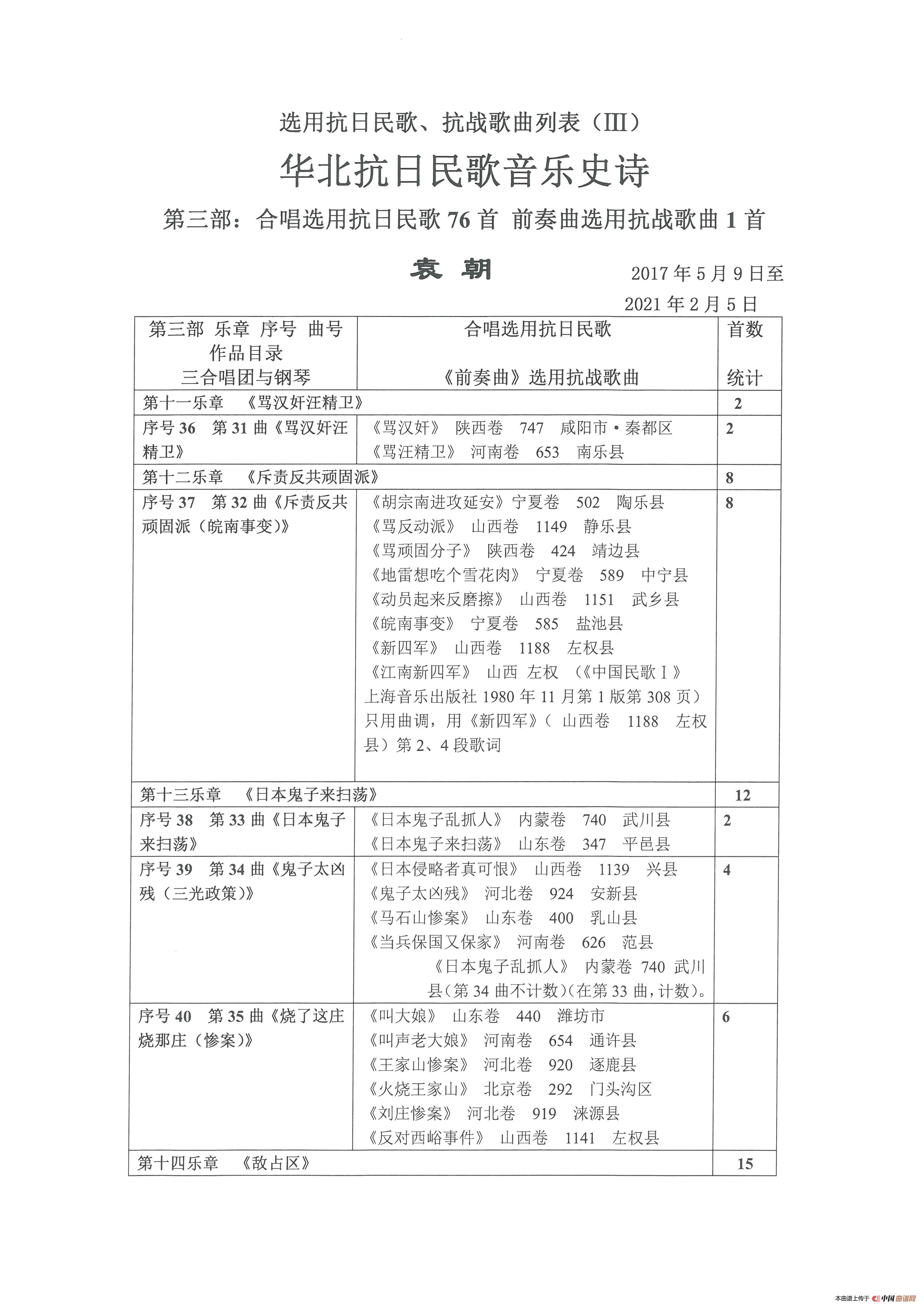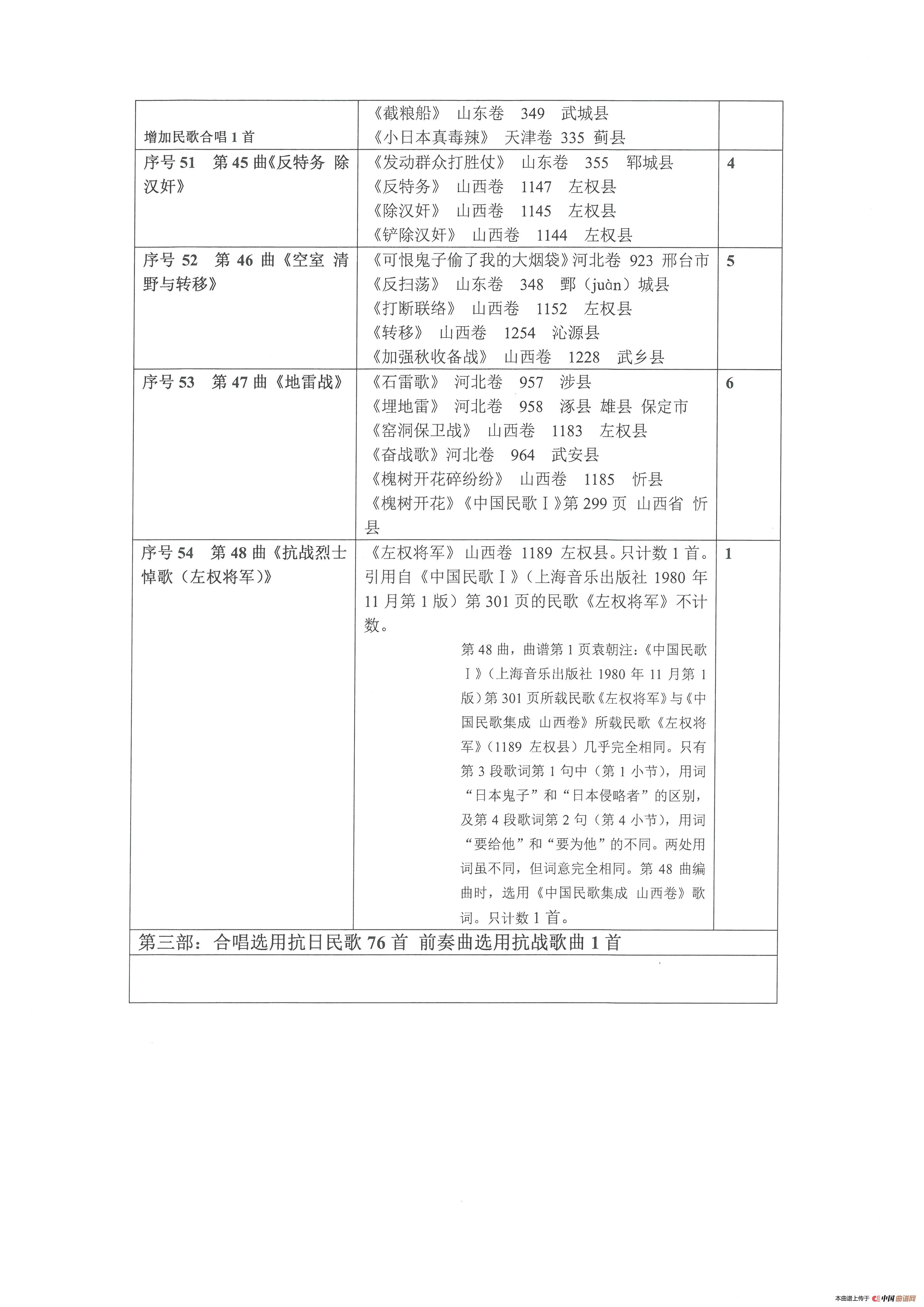 《选用抗日民歌、抗战歌曲列表》(Ⅲ 第三部)