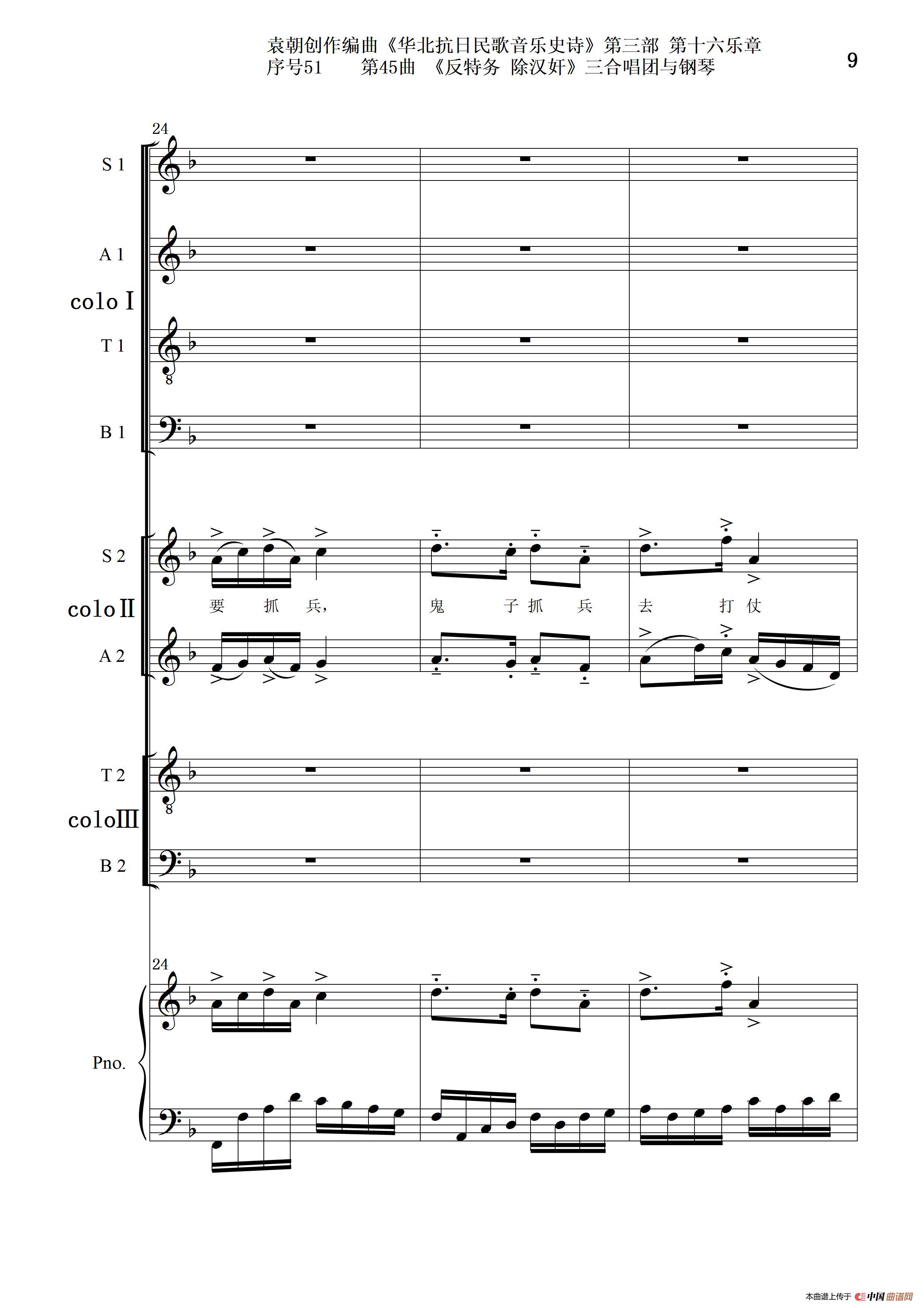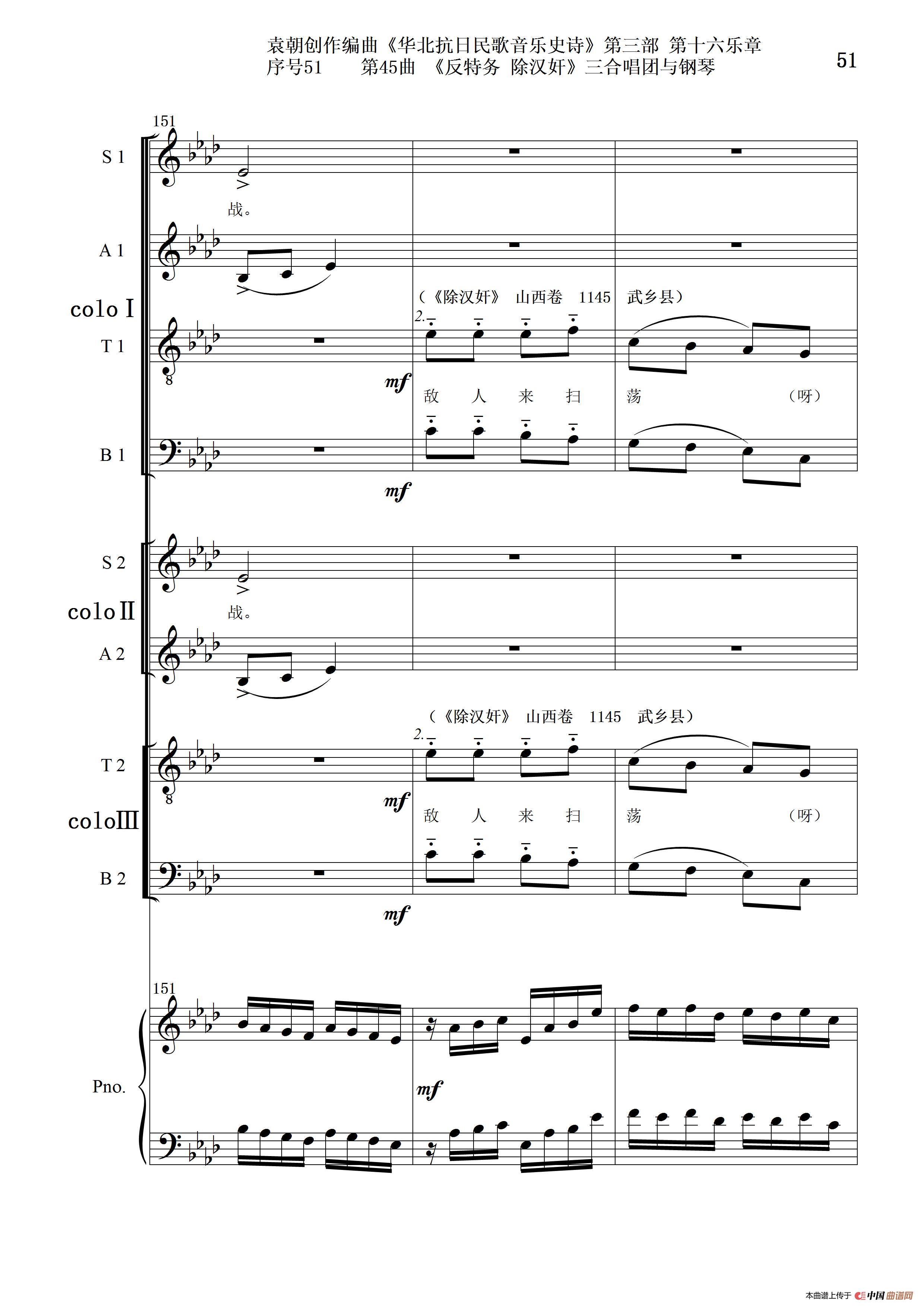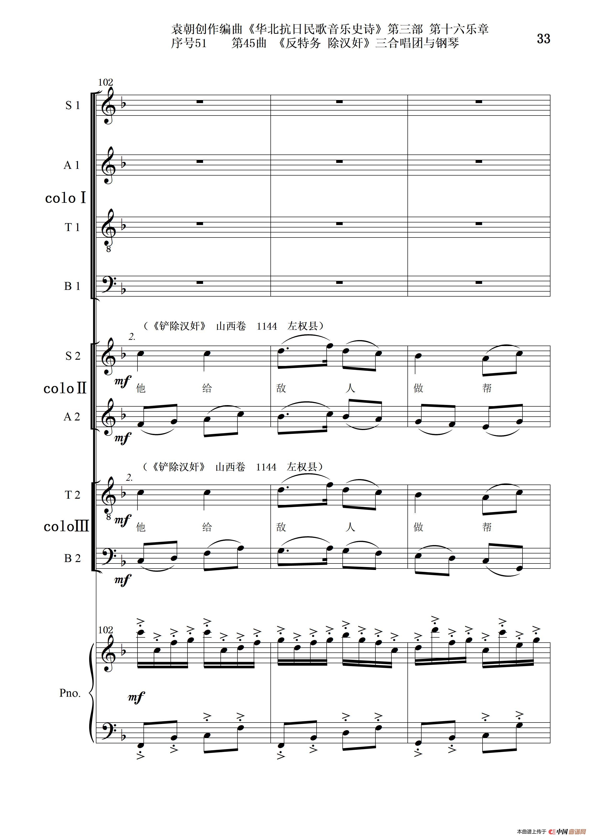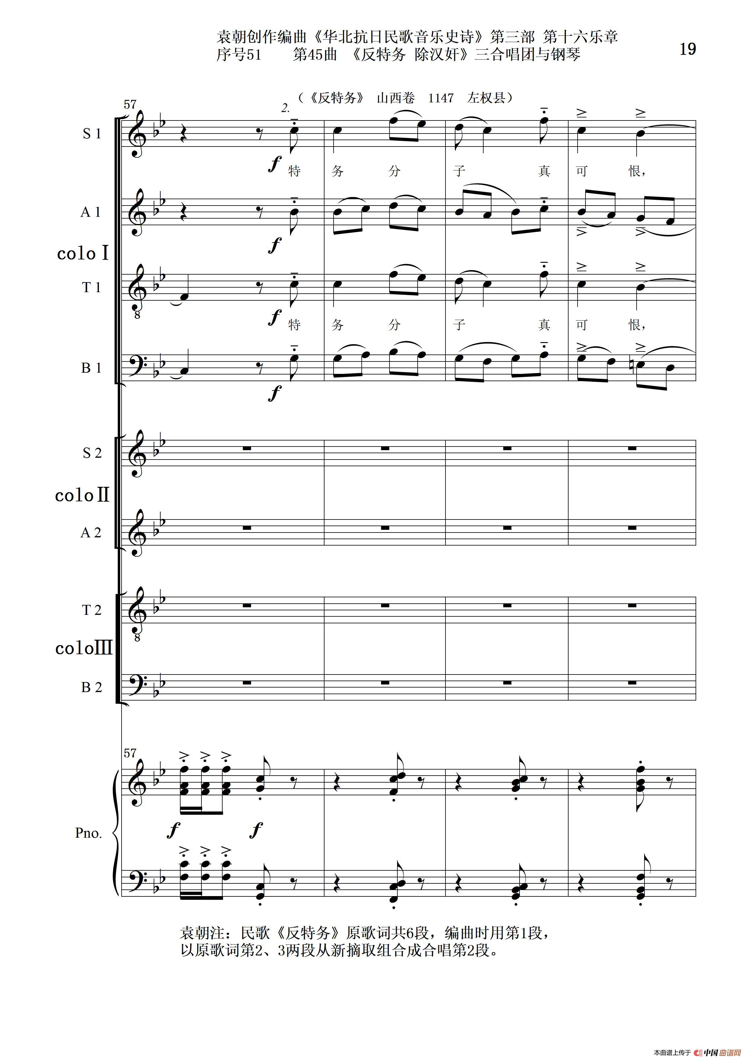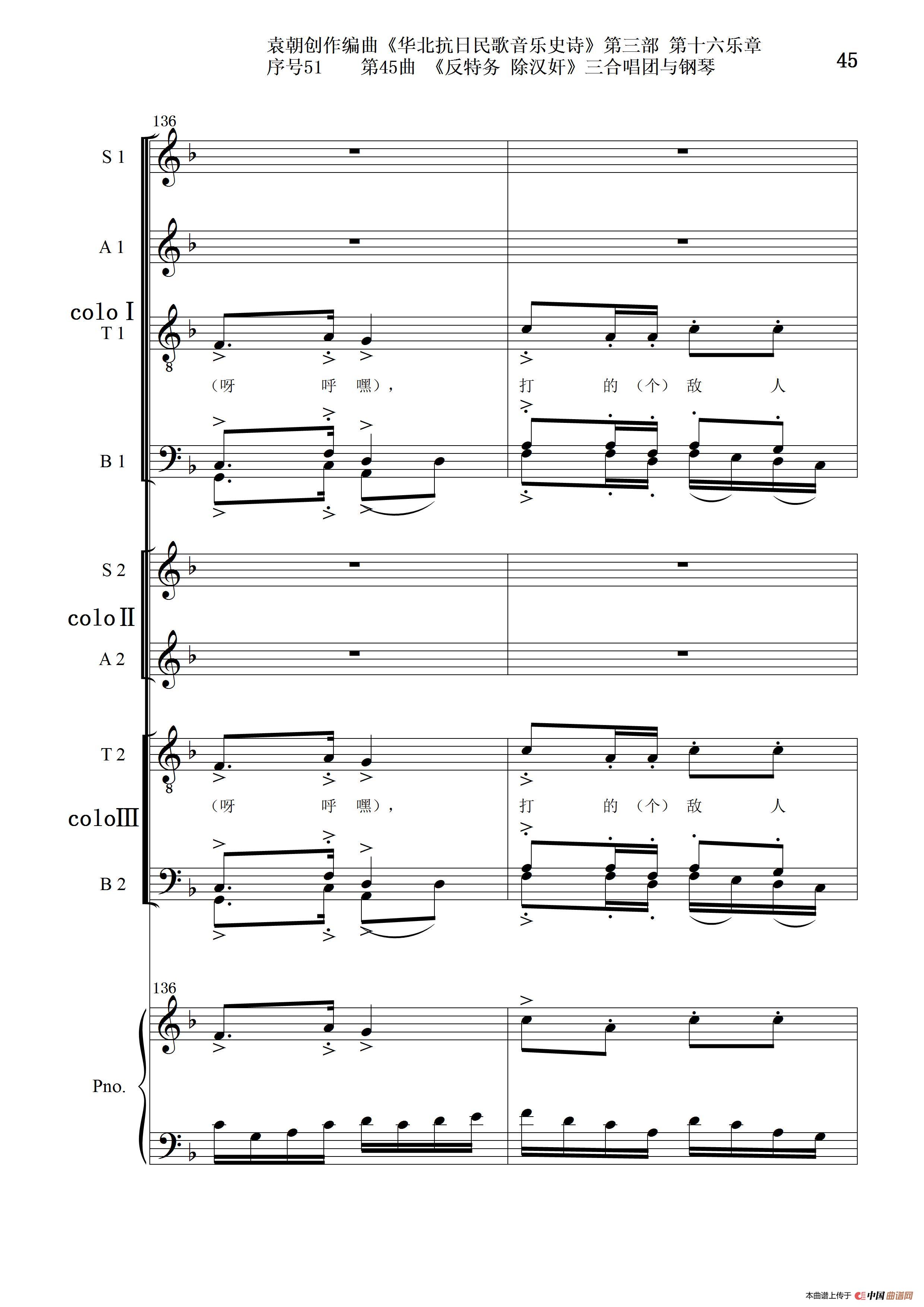 关于《序号51第45曲《反特务 除汉奸》三合唱团与钢琴》曲谱的评论