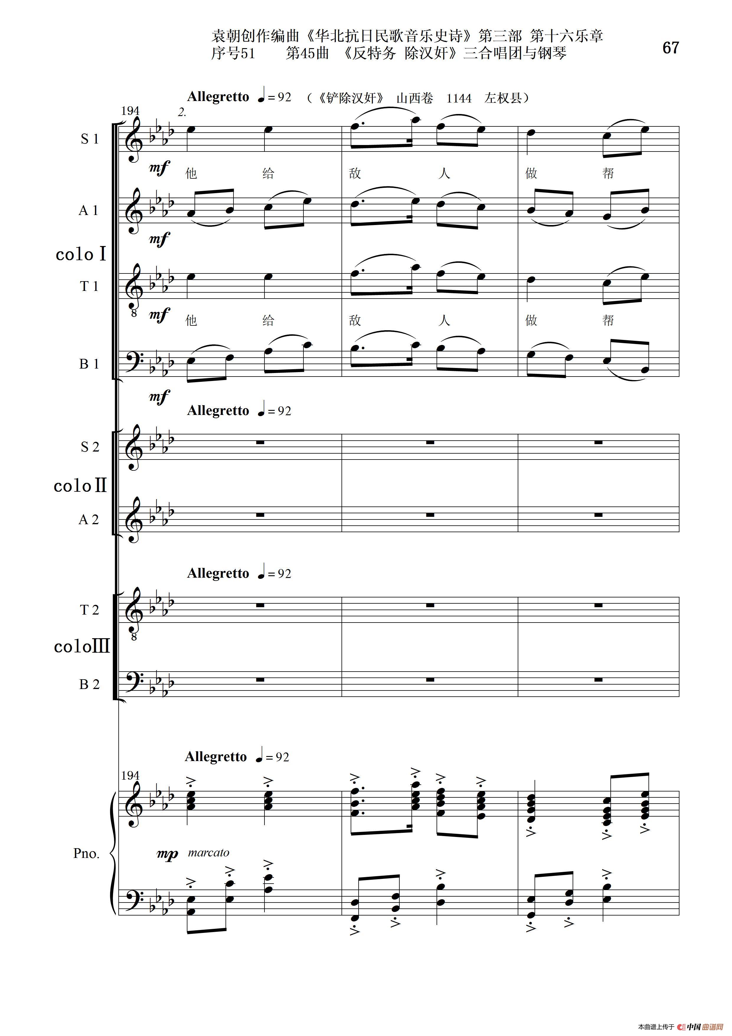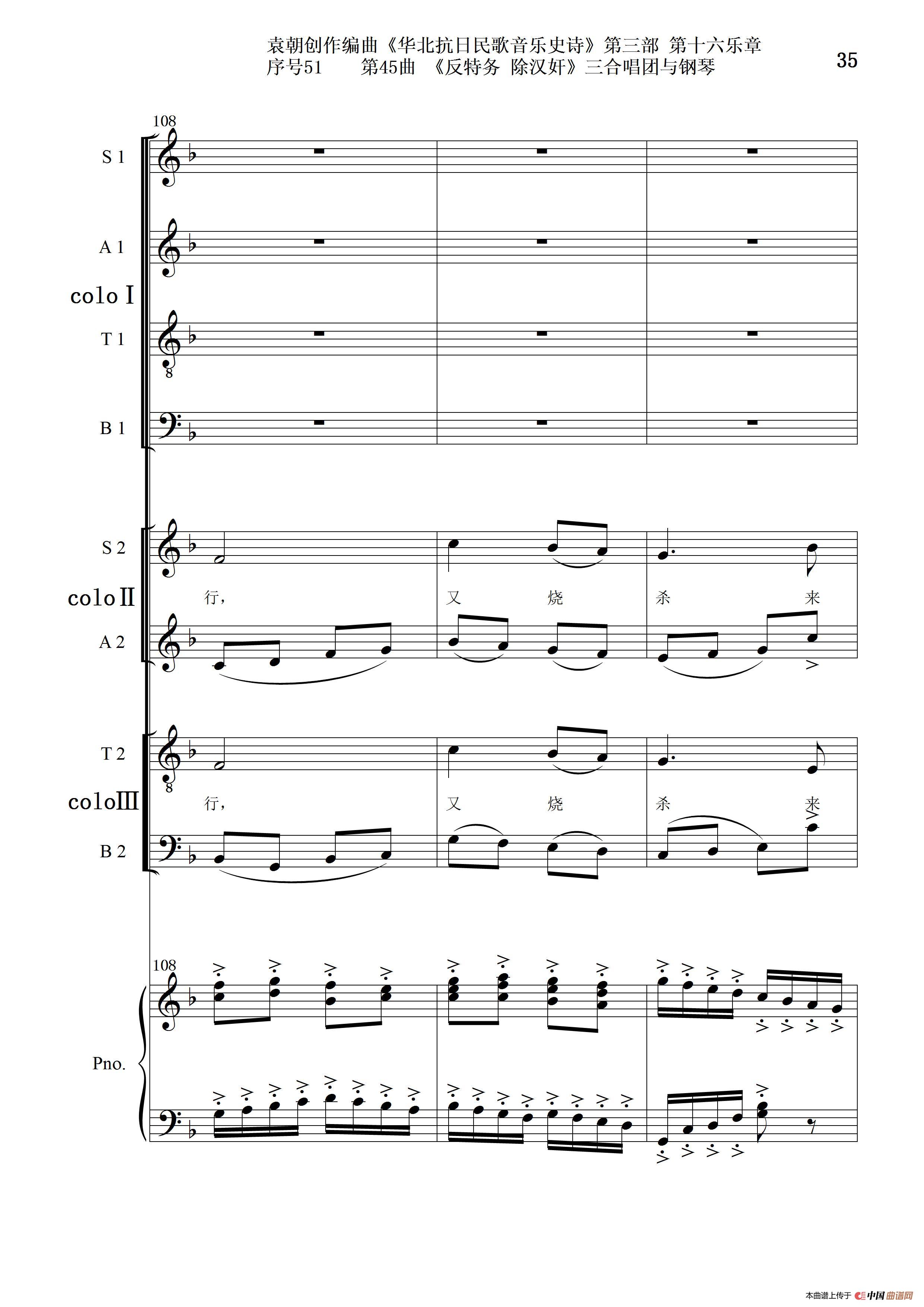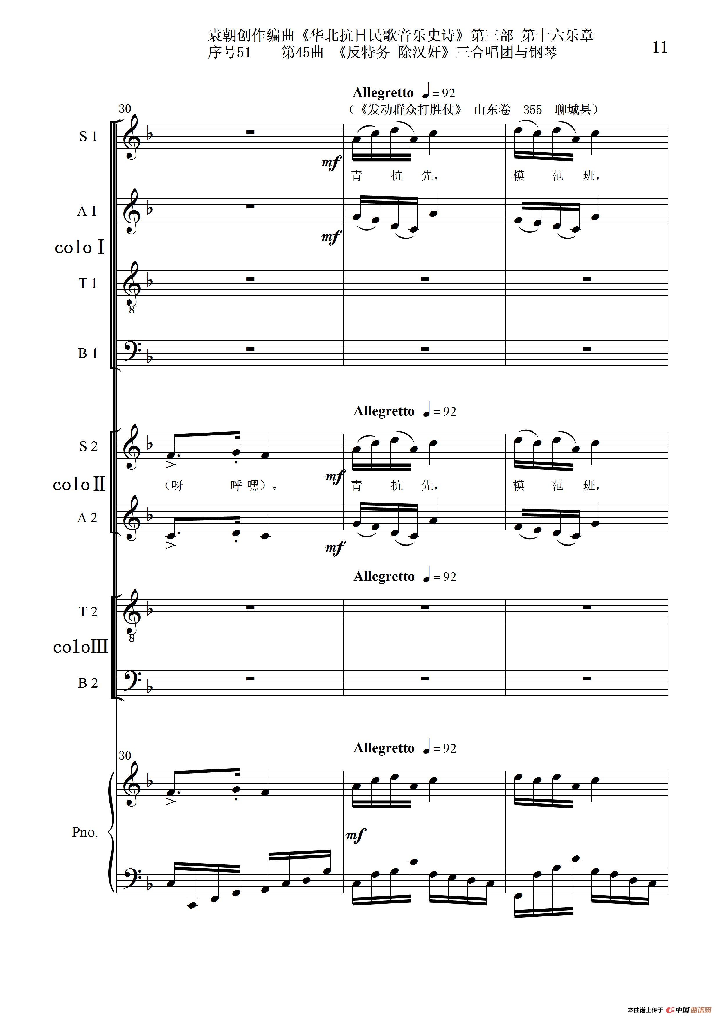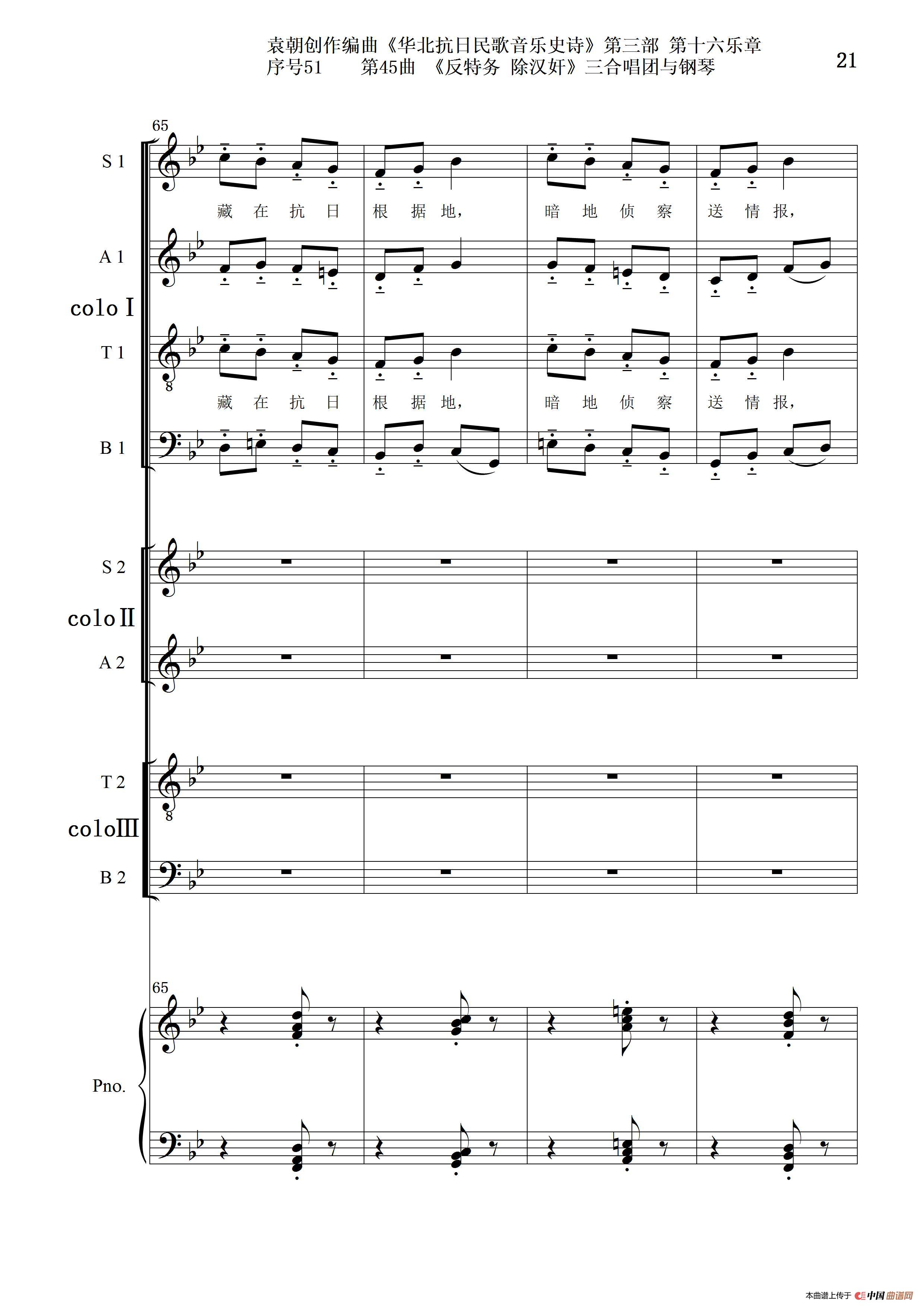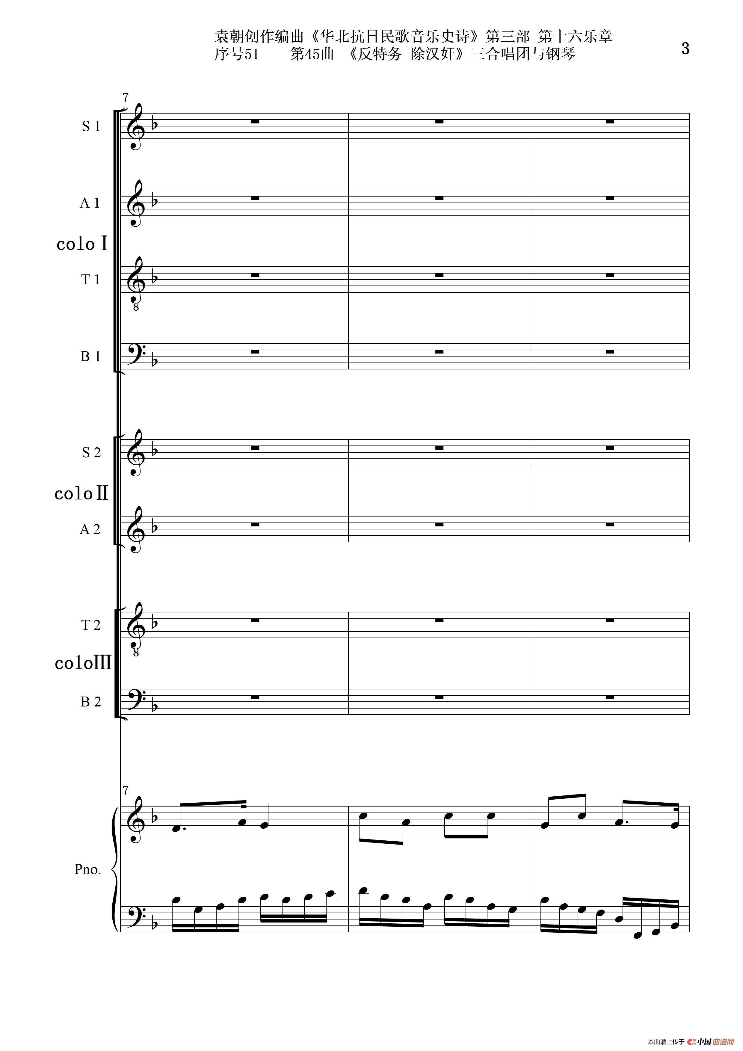 关于《序号51第45曲《反特务 除汉奸》三合唱团与钢琴》曲谱的评论