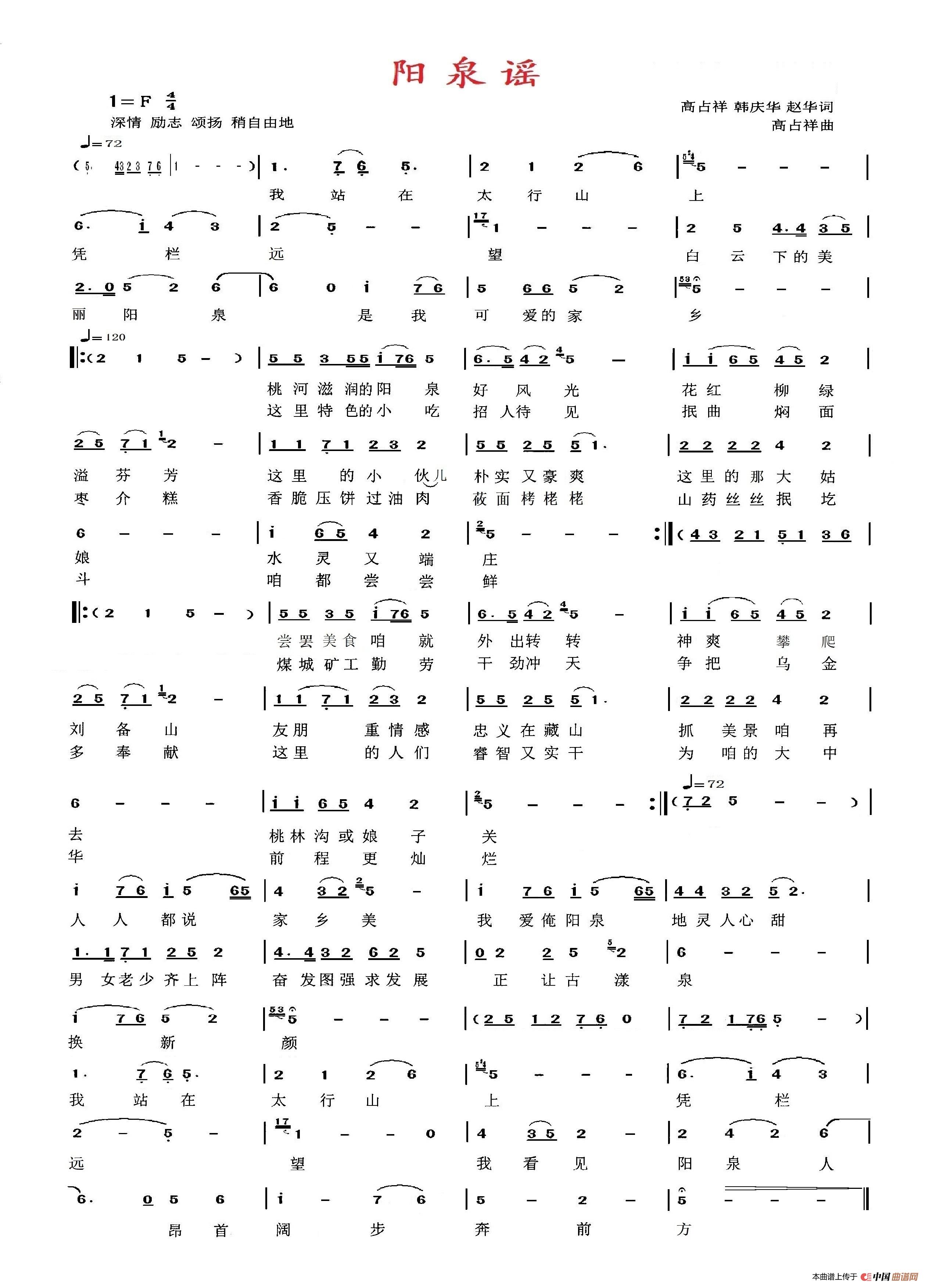 现将近日完成拟、编工作的《阳泉谣》之词曲图片(由于版面所限略去引子)及其旋律音频上传。这首试求往山西民歌风靠一靠的歌,其实际效果如何?还是以留给大家的听后感为准,敬请鉴赏,欢迎指正。谢谢大家!天津高占祥