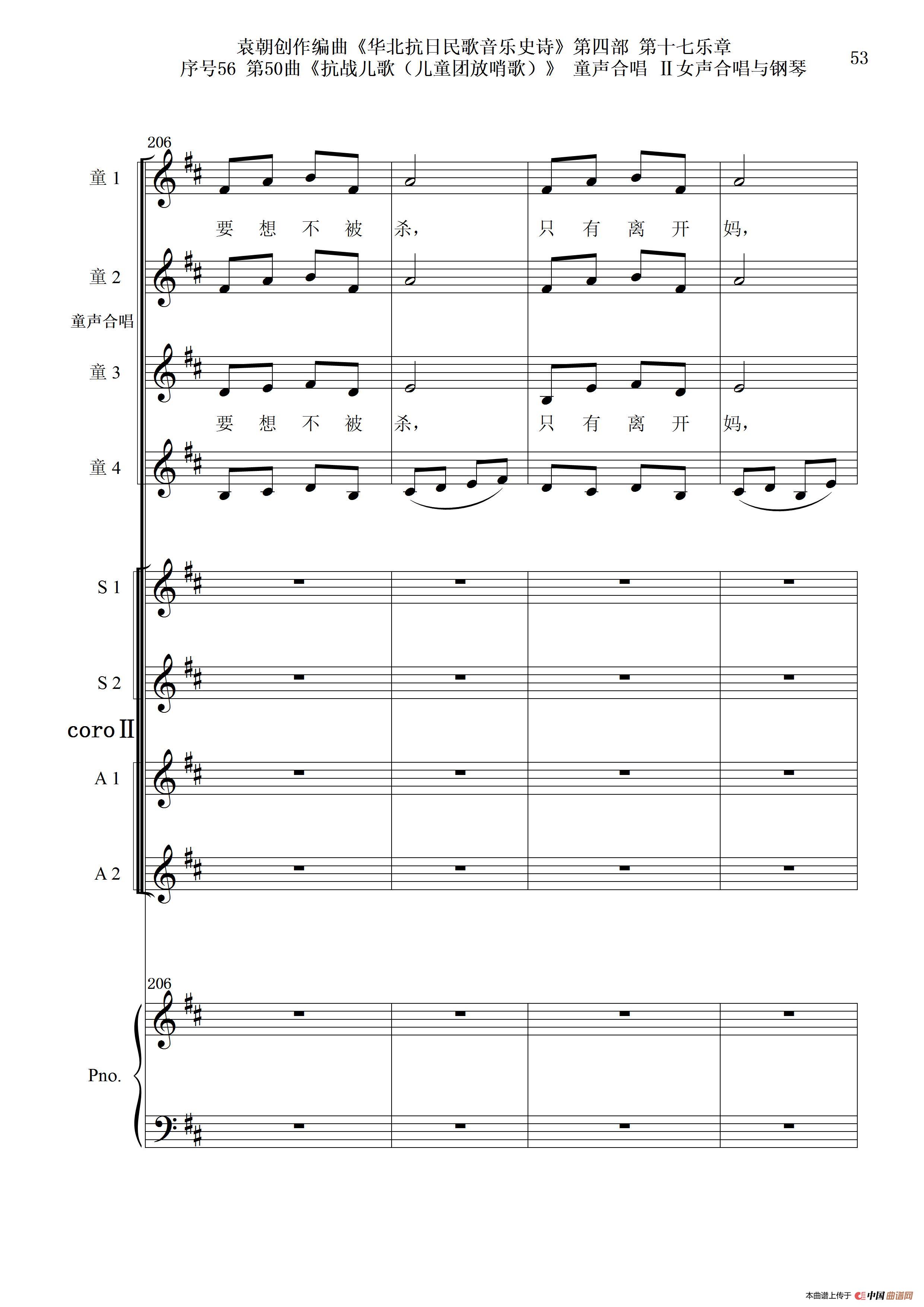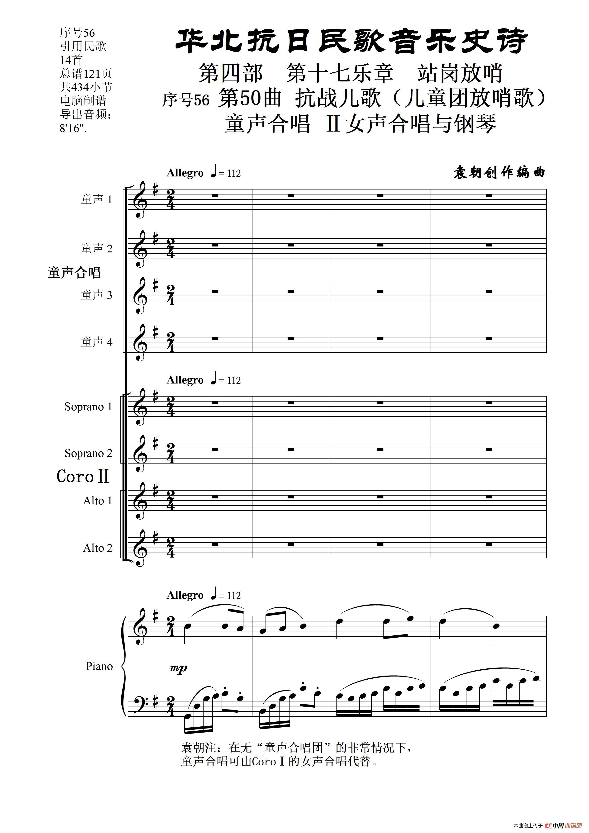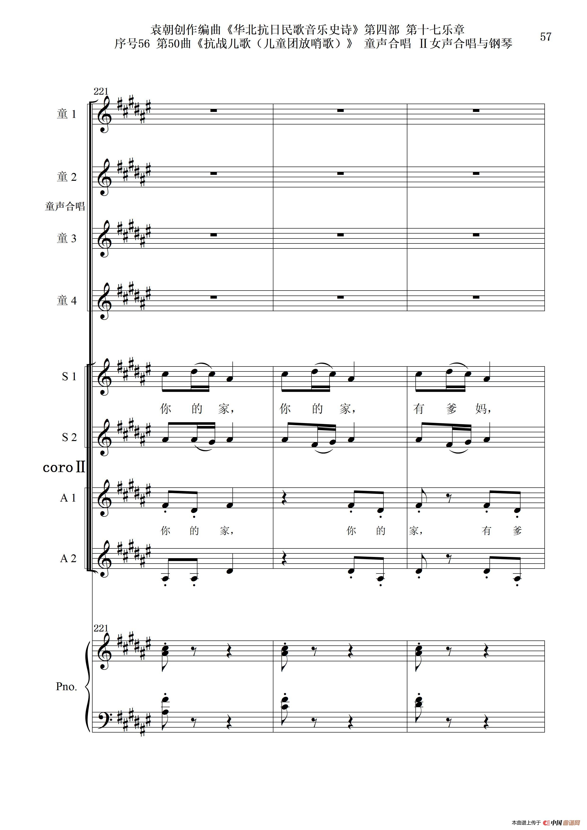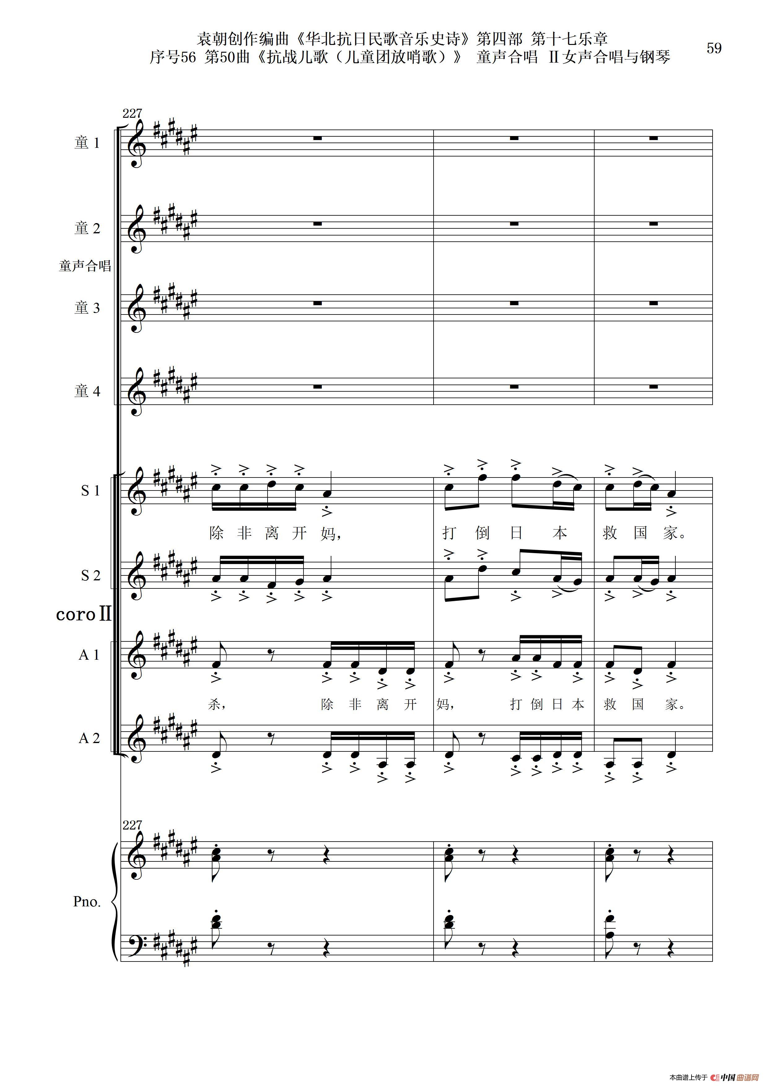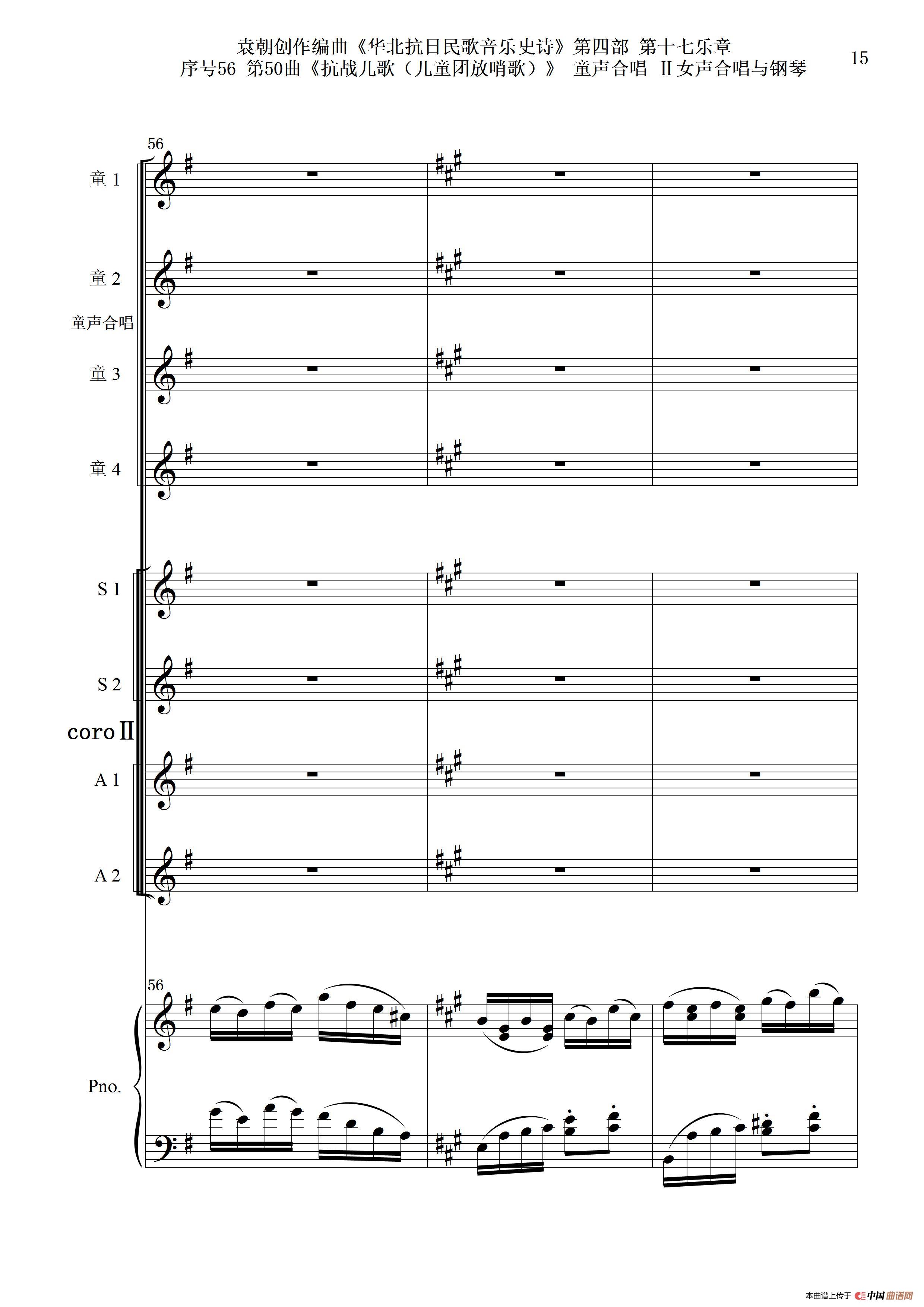序号56第50曲《抗日儿歌(儿童团放哨歌)》童声合唱(或Ⅰ女声合唱代替)Ⅱ女声合唱与钢琴