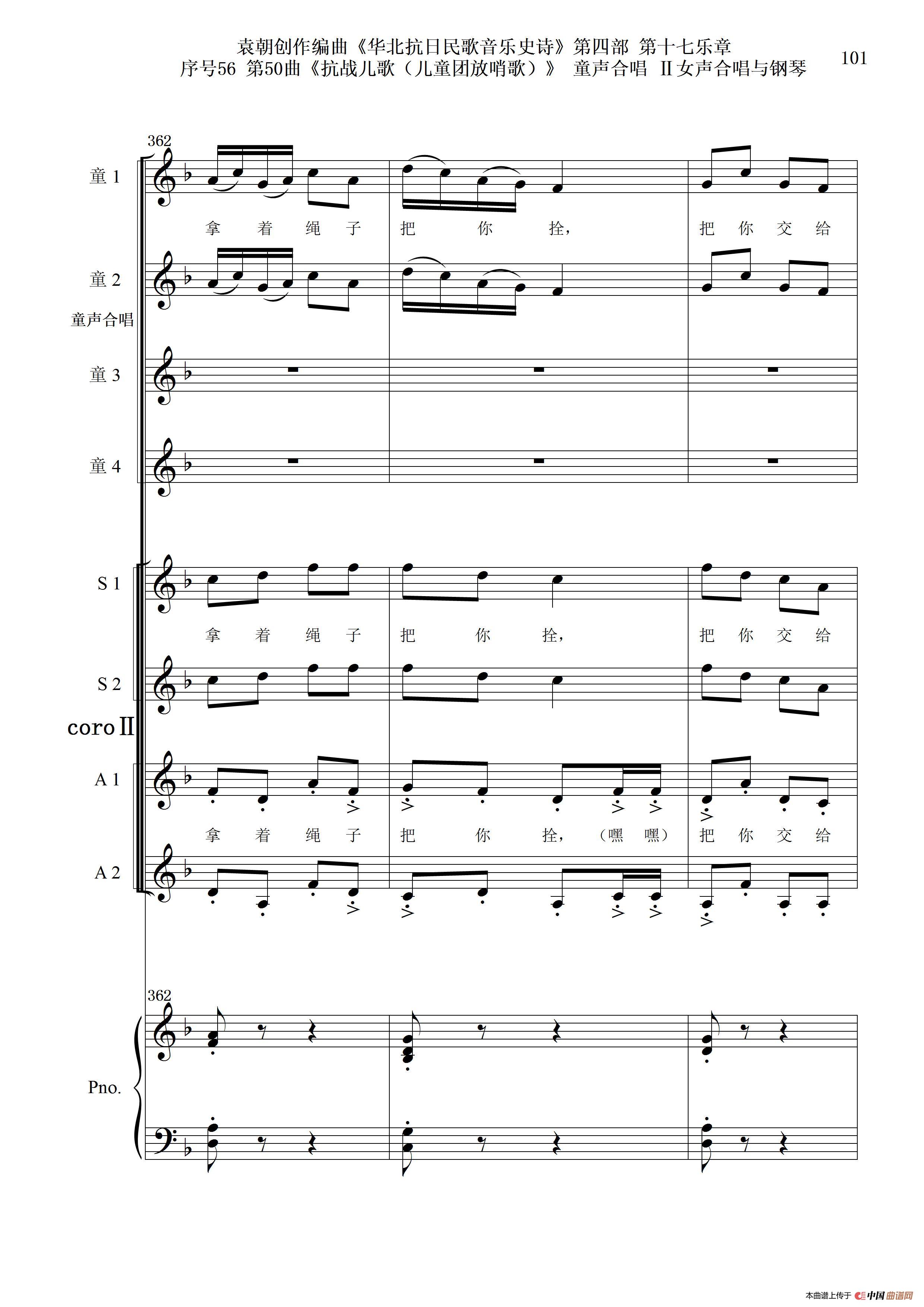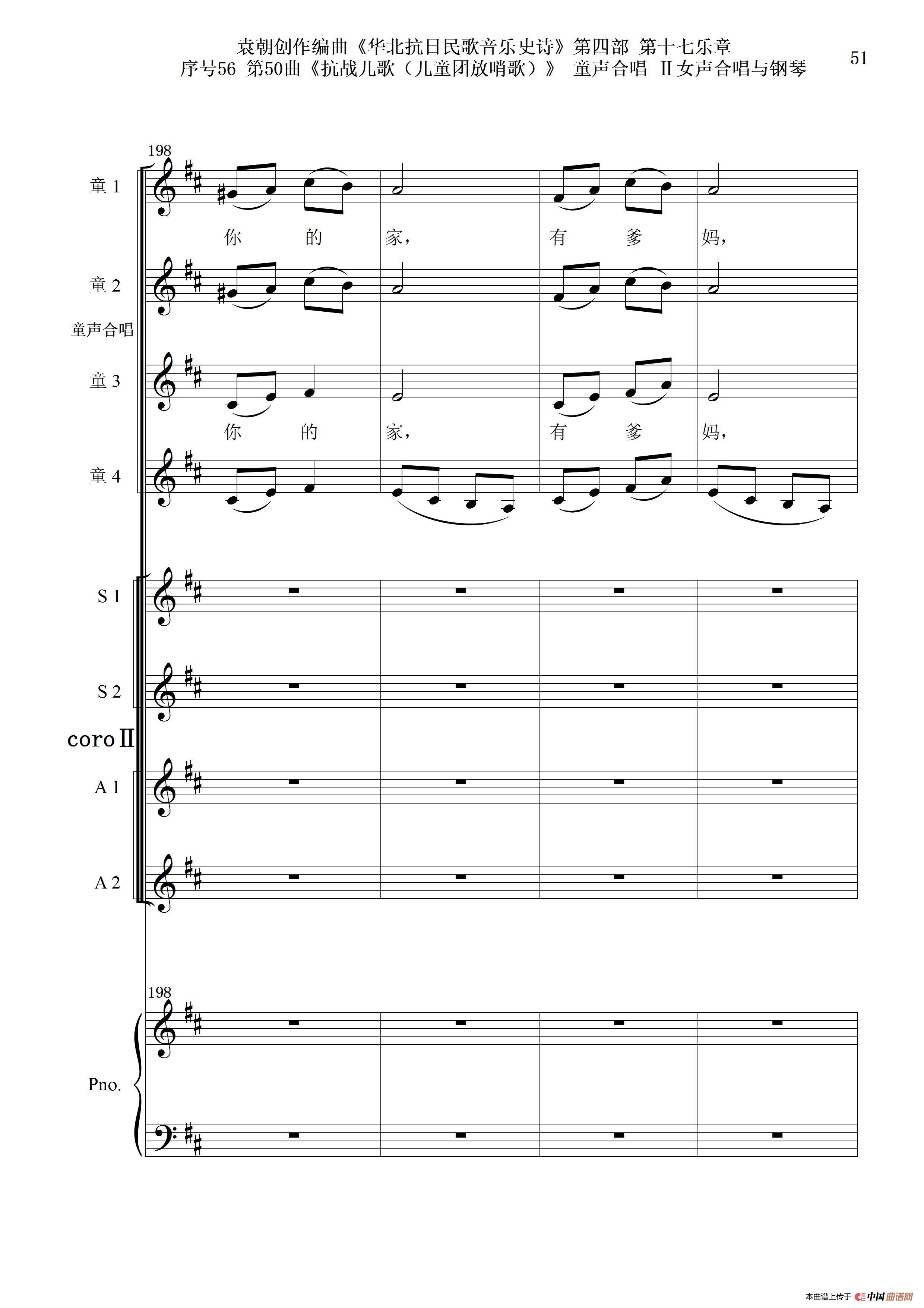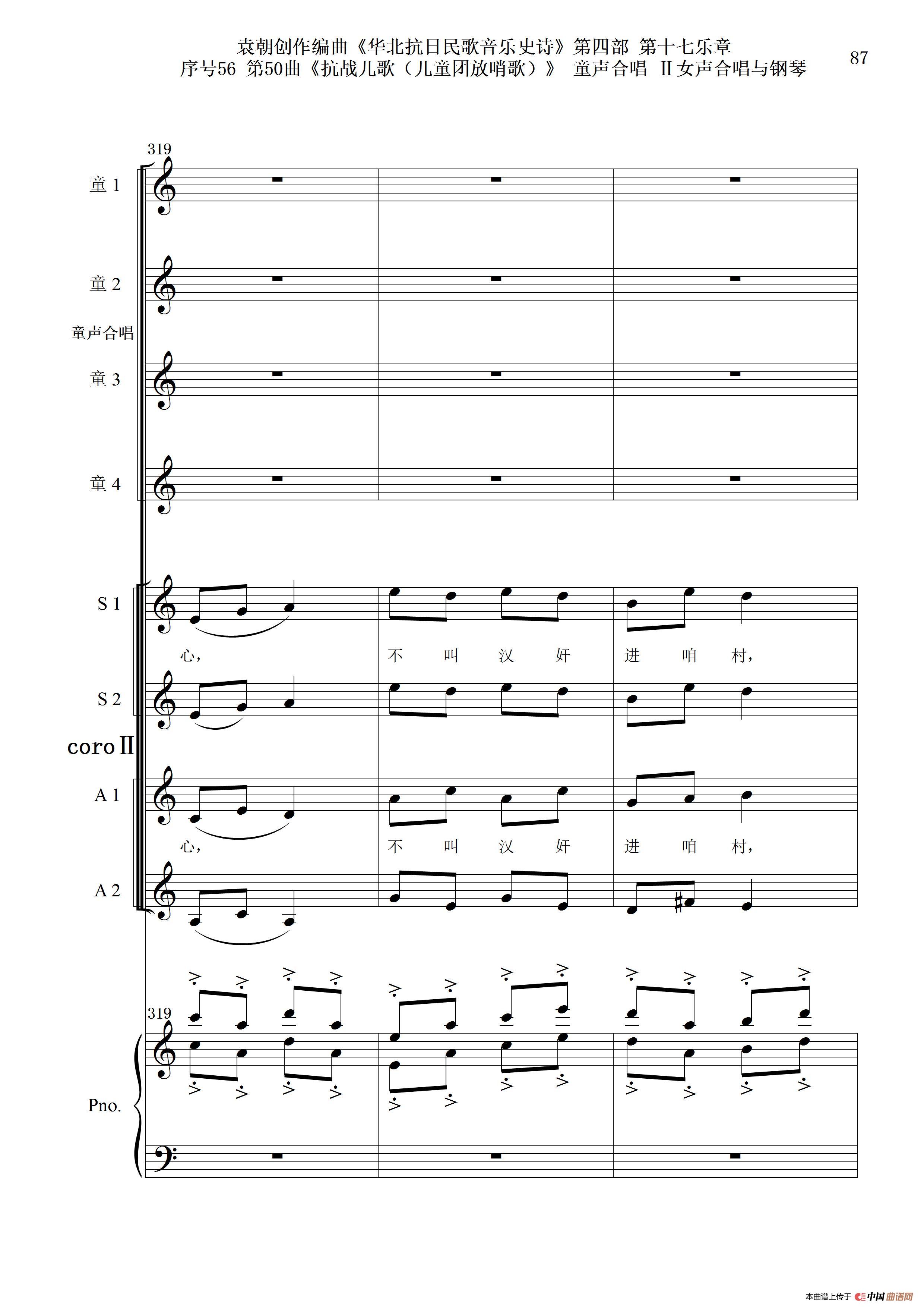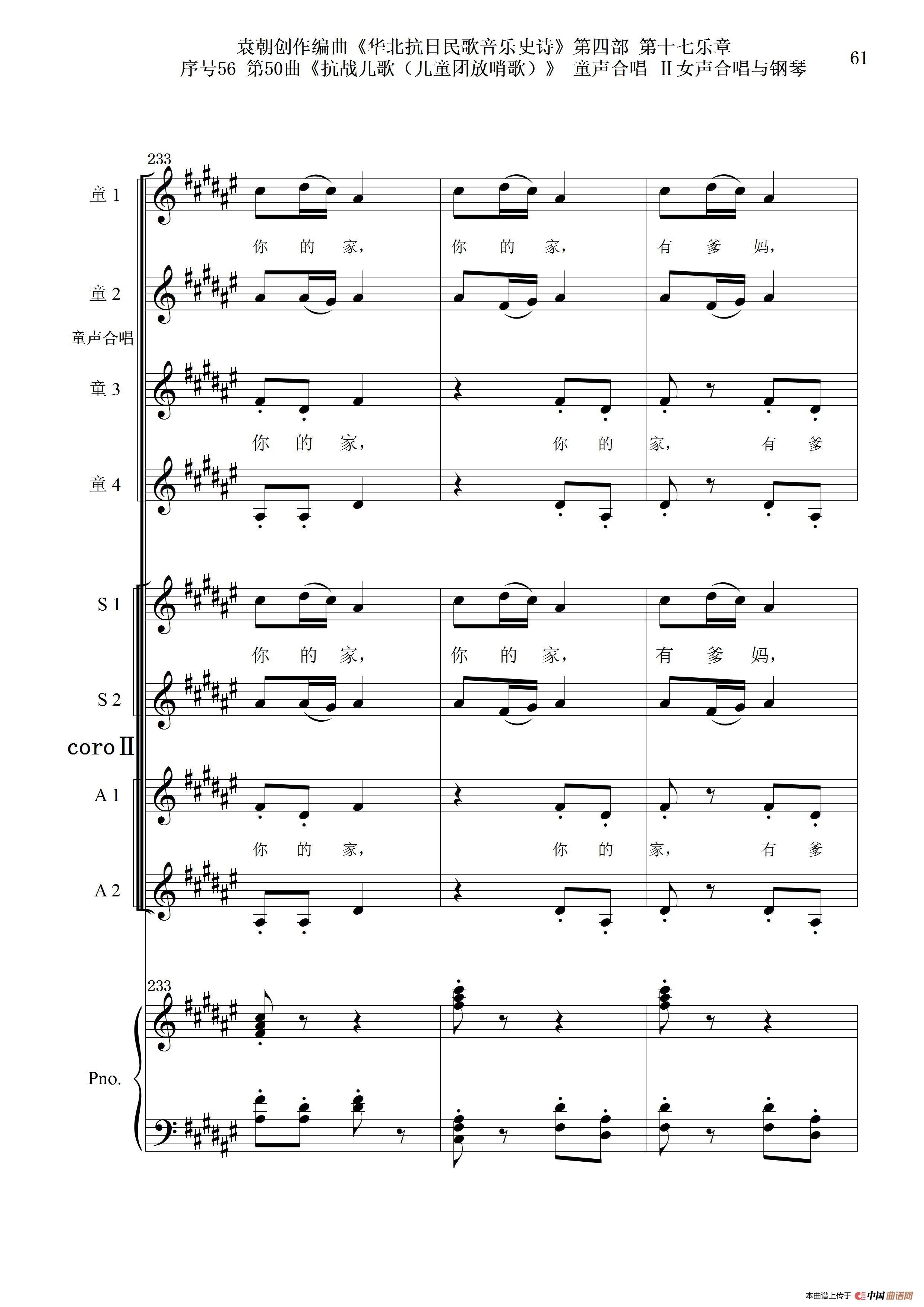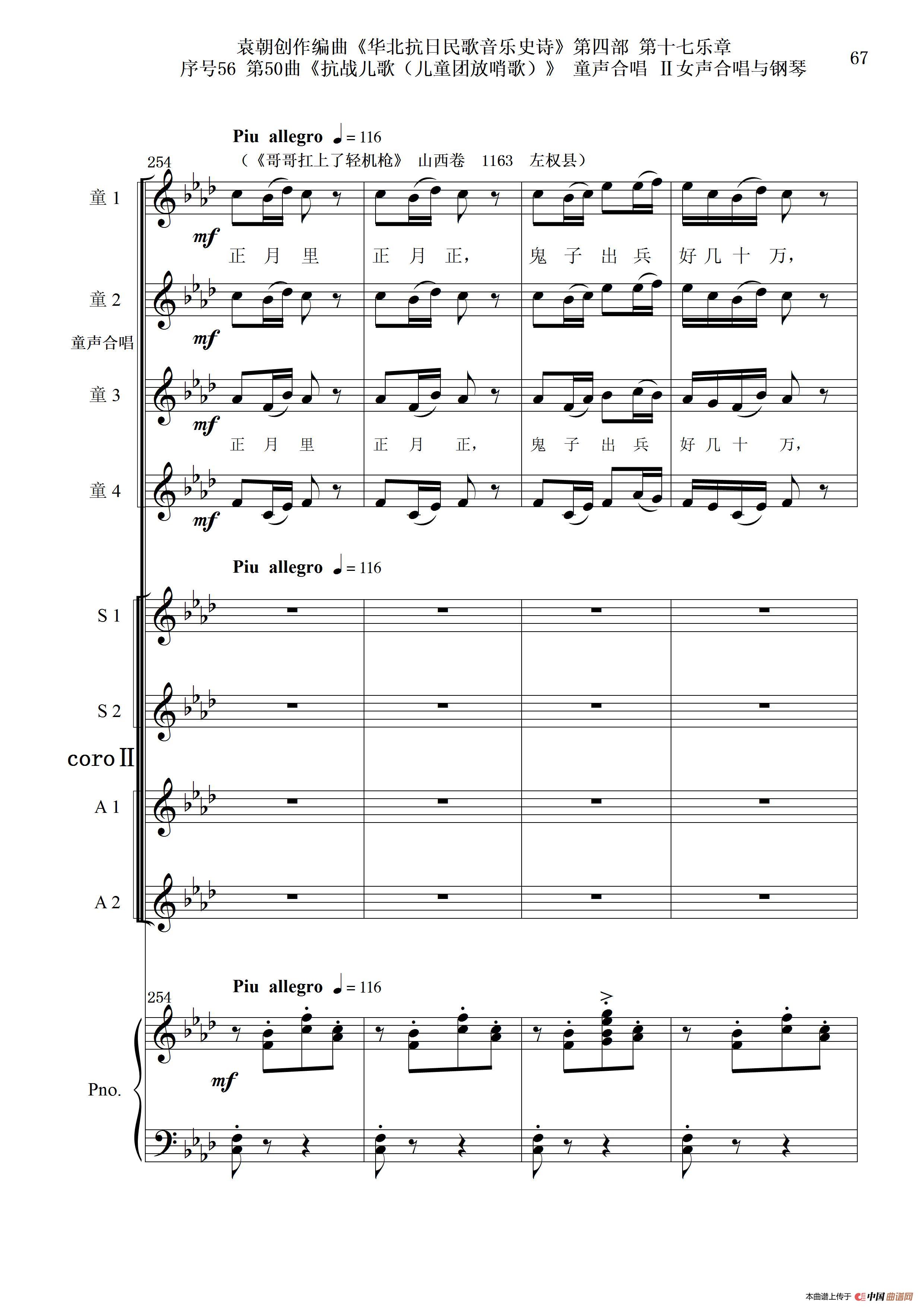 序号56第50曲《抗日儿歌(儿童团放哨歌)》童声合唱(或Ⅰ女声合唱代替)Ⅱ女声合唱与钢琴